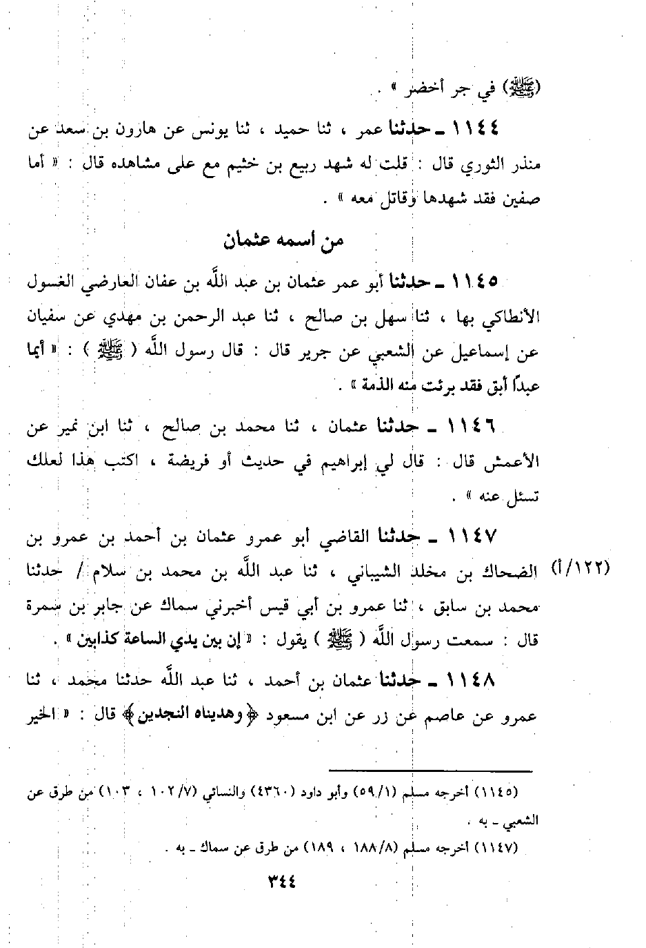 1132 - حَدَّثَنَا عُثْمَانُ، سَمِعْتُ جَعْفَرَ بْنَ أَبِي عُثْمَانَ يَقُولُ: سَمِعْتُ يَحْيَى بْنَ مَعِينٍ يَقُولُ: «§الْقَاسِمُ بْنُ مُحَمَّدٍ عَنْ عَائِشَةَ مُشَبَّكٌ بِالذَّهَبِ، وَعَبْدُ اللَّهِ بْنُ عُمَرَ عَنِ الْقَاسِمِ مُشَبَّكٌ بِالذَّهَبِ» . حَدَّثَنَا عُثْمَانُ بْنُ مُحَمَّدِ بْنِ عُثْمَانَ بْنِ مُحَمَّدِ بْنِ عَبْدِ الْمَلِكِ بْنِ سُلَيْمَانَ بْنِ عَبْدِ الْمَلِكِ بْنِ سُلَيْمَانَ بْنِ عَبْدِ الْمَلِكِ بْنِ عَبْدِ اللَّهِ بْنِ عَنْبَسَةَ بْنِ عَمْرِو بْنِ عُثْمَانَ بْنِ عَفَّانَ، ثَنَا ابْنُ مُكْرَمٍ، بِالْبَصْرَةِ، ثَنَا مُحَمَّدُ بْنُ يَزِيدَ الْأَسْفَاطِيُّ قَالَ: حَدَّثَنِي عَلِيُّ بْنُ الْمَدِينِيِّ، ثَنَا حَمَّادُ بْنُ دَلِيلٍ، ثَنَا شُعْبَةُ، -[345]- عَنْ أَبِي إِسْحَاقَ، عَنْ الْحَارِثِ الْأَرْفَعِ قَالَ. . . . . . . . . . .: قَالَ: نَعَمْ قَالَ شُعْبَةُ: فَقُلْتُ لِأَبِي إِسْحَاقَ مِمَّنْ سَمِعْتَهُ؟ مَا يَدَعُ صِدْقَكَ يَا شُعْبَةُ حَدَّثَنِيهِ مُجَاهِدٌ عَنْ الْحَارِثِ بْنِ الْأَرْفَعِ. حَدَّثَنَا عُثْمَانُ بْنُ مُحَمَّدِ بْنِ عُثْمَانَ، ثَنَا مُكْرَمٍ قَالَ: سَمِعْتُ يَعْقُوبَ بْنَ إِبْرَاهِيمَ يَقُولُ: سَمِعْتُ عَبْدَ الرَّحْمَنِ بْنَ مَهْدِيٍّ يَقُولُ: أَصْلَحُ أَهْلِ الدُّنْيَا حَدَّثَنَا عَنْ أَبِي إِسْحَاقَ، شُعْبَةُ وَذَاكَ إِنْ كَانَ. . . . . .