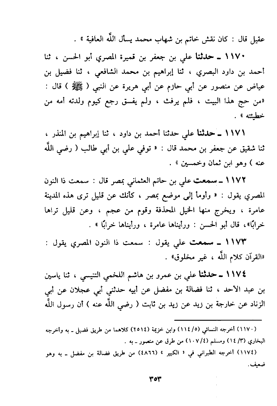 1153 - حَدَّثَنَا عَلِيٌّ، ثنا يَحْيَى بْنُ عُثْمَانَ، ثنا أَبُو صَالِحٍ الْحَرَّانِيُّ، ثنا حَيُّونُ بْنُ صَالِحٍ، شَيْخٌ مِصْرِيٌّ قَالَ: سَمِعْتُ مَالِكًا يَقُولُ: «§تُرَدُّ الدَّارُ مِنْ سُوءِ الْجِوَارِ»