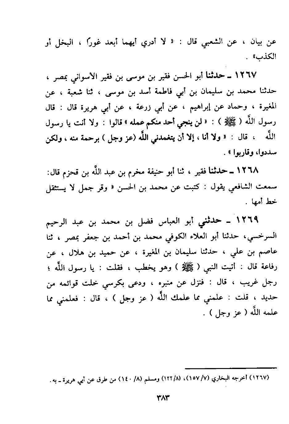 1249 - حَدَّثَنَا أَبُو الْحَسَنِ فَقِيرُ بْنُ مُوسَى بْنِ فَقِيرٍ الْأَسْوَانِيُّ بِمِصْرَ، حَدَّثَنَا مُحَمَّدُ بْنُ سُلَيْمَانَ بْنِ أَبِي فَاطِمَةَ عَنْ أَسَدِ بْنِ مُوسَى، ثنا شُعْبَةُ، عَنِ الْمُغِيرَةِ، وَحَمَّادٌ، عَنْ إِبْرَاهِيمَ، عَنْ أَبِي زُرْعَةَ عَنْ أَبِي هُرَيْرَةَ قَالَ: قَالَ رَسُولُ اللَّهِ صَلَّى اللَّهُ عَلَيْهِ وَسَلَّمَ: «§لَنْ يُنَجِّيَ أَحَدًا مِنْكُمْ عَمَلُهُ» قَالُوا: وَلَا أَنْتَ يَا رَسُولَ اللَّهِ قَالَ: «وَلَا أَنَا إِلَّا أَنْ يَتَغَمَّدَنِي اللَّهُ عَزَّ وَجَلَّ بِرَحْمَةٍ مِنْهُ، وَلَكِنْ سَدِّدُوا، وَقَارِبُوا»