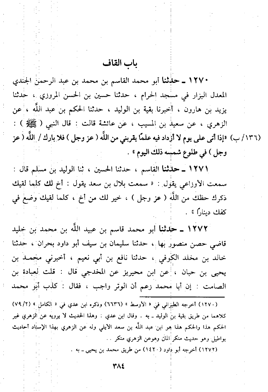 1252 - حَدَّثَنَا أَبُو مُحَمَّدٍ الْقَاسِمُ بْنُ مُحَمَّدِ بْنِ عَبْدِ الرَّحْمَنِ الْجَنَدِيُّ الْمُعَدَّلُ الْبَزَّارُ، فِي مَسْجِدِ الْحَرَامِ , حَدَّثَنَا حُسَيْنُ بْنُ الْحَسَنِ الْمَرْوَزِيُّ , حَدَّثَنَا يَزِيدُ بْنُ هَارُونَ، أَخْبَرَنَا بَقِيَّةُ بْنُ الْوَلِيدِ، حَدَّثَنَا الْحَكَمُ بْنُ عَبْدِ اللَّهِ، عَنِ الزُّهْرِيِّ، عَنْ سَعِيدِ بْنِ الْمُسَيِّبِ، عَنْ عَائِشَةَ قَالَتْ: قَالَ النَّبِيُّ صَلَّى اللَّهُ عَلَيْهِ وَسَلَّمَ: «§إِذَا أَتَى عَلَيَّ يَوْمٌ لَا أَزْدَادُ فِيهِ عِلْمًا يُقَرِّبُنِي مِنَ اللَّهِ عَزَّ وَجَلَّ فَلَا بَارَكَ اللَّهُ عَزَّ وَجَلَّ فِي طُلُوعِ شَمْسِ ذَلِكَ الْيَوْمِ»