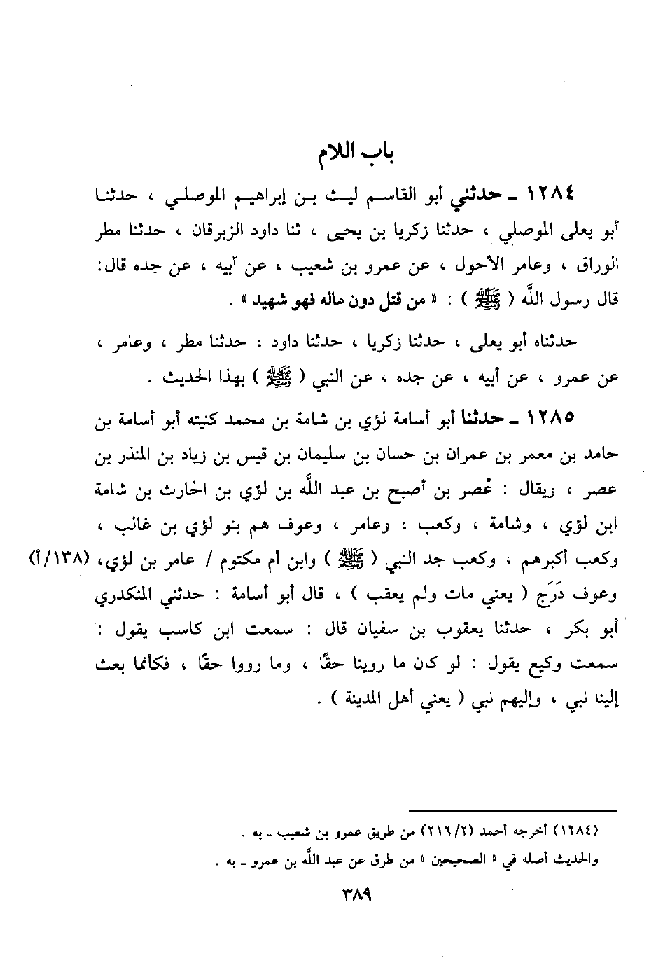 1266 - حَدَّثَنِي أَبُو الْقَاسِمِ لَيْثُ بْنُ إِبْرَاهِيمَ الْمَوْصِلِيُّ، حَدَّثَنَا أَبُو يَعْلَى الْمَوْصِلِيُّ، حَدَّثَنَا زَكَرِيَّا بْنُ يَحْيَى، ثنا دَاوُدُ الزِّبْرِقَانُ، حَدَّثَنَا مَطَرٌ الْوَرَّاقُ، وَعَامِرٌ الْأَحْوَلُ، عَنْ عَمْرِو بْنِ شُعَيْبٍ، عَنْ أَبِيهِ، عَنْ جَدِّهِ قَالَ: قَالَ رَسُولُ اللَّهِ صَلَّى اللَّهُ عَلَيْهِ وَسَلَّمَ: «§مَنْ قُتِلَ دُونَ مَالِهِ فَهُوَ شَهِيدٌ» حَدَّثَنَاهُ أَبُو يَعْلَى، حَدَّثَنَا زَكَرِيَّا، حَدَّثَنَا دَاوُدُ، حَدَّثَنَا مَطَرٌ، وَعَامِرٌ، عَنْ عَمْرٍو، عَنْ أَبِيهِ، عَنْ جَدِّهِ، عَنِ النَّبِيِّ صَلَّى اللَّهُ عَلَيْهِ وَسَلَّمَ بِهَذَا الْحَدِيثِ