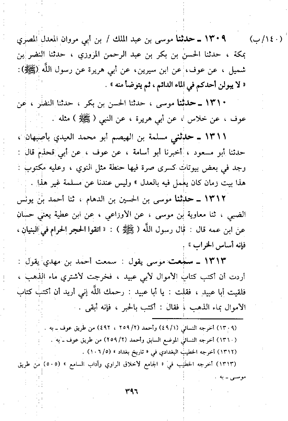 1293 - حَدَّثَنَا مُوسَى بْنُ عَبْدِ الْمَلِكِ بْنِ أَبِي مَرْوَانَ الْمُعَدَّلُ الْمِصْرِيُّ، بِمَكَّةَ، حَدَّثَنَا الْحَسَنُ بْنُ بَكْرِ بْنِ عَبْدِ الرَّحْمَنِ الْمَرْوَزِيُّ، حَدَّثَنَا النَّضْرُ بْنُ شُمَيْلٍ، عَنْ عَوْفٍ، عَنِ ابْنِ سِيرِينَ، عَنْ أَبِي هُرَيْرَةَ، عَنْ رَسُولِ اللَّهِ صَلَّى اللَّهُ عَلَيْهِ وَسَلَّمَ: «§لَا يَبُولَنَّ أَحَدُكُمْ فِي الْمَاءِ الدَّائِمِ، ثُمَّ يَتَوَضَّأُ مِنْهُ» حَدَّثَنَا مُوسَى، حَدَّثَنَا الْحَسَنُ بْنُ بَكْرٍ، حَدَّثَنَا النَّضْرُ، عَنْ عَوْفٍ، عَنْ خِلَاسٍ، عَنْ أَبِي هُرَيْرَةَ، عَنِ النَّبِيِّ صَلَّى اللَّهُ عَلَيْهِ وَسَلَّمَ مِثْلَهُ