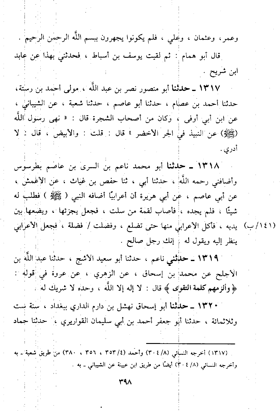 1300 - حَدَّثَنَا أَبُو مَنْصُورٍ نَصْرُ بْنُ عَبْدِ اللَّهِ، مَوْلَى أَحْمَدَ بْنِ رُسْتَةَ، حَدَّثَنَا أَحْمَدُ بْنُ عِصَامٍ، حَدَّثَنَا أَبُو عَاصِمٍ، حَدَّثَنَا شُعْبَةُ، عَنِ الشَّيْبَانِيِّ، عَنِ ابْنِ أَبِي أَوْفَى وَكَانَ، مِنْ أَصْحَابِ الشَّجَرَةِ قَالَ: «نَهَى رَسُولُ اللَّهِ صَلَّى اللَّهُ عَلَيْهِ وَسَلَّمَ §عَنِ النَّبِيذِ فِي الْجَرِّ الْأَخْضَرِ» قَالَ: قُلْتُ: وَالْأَبْيَضِ قَالَ: لَا أَدْرِي