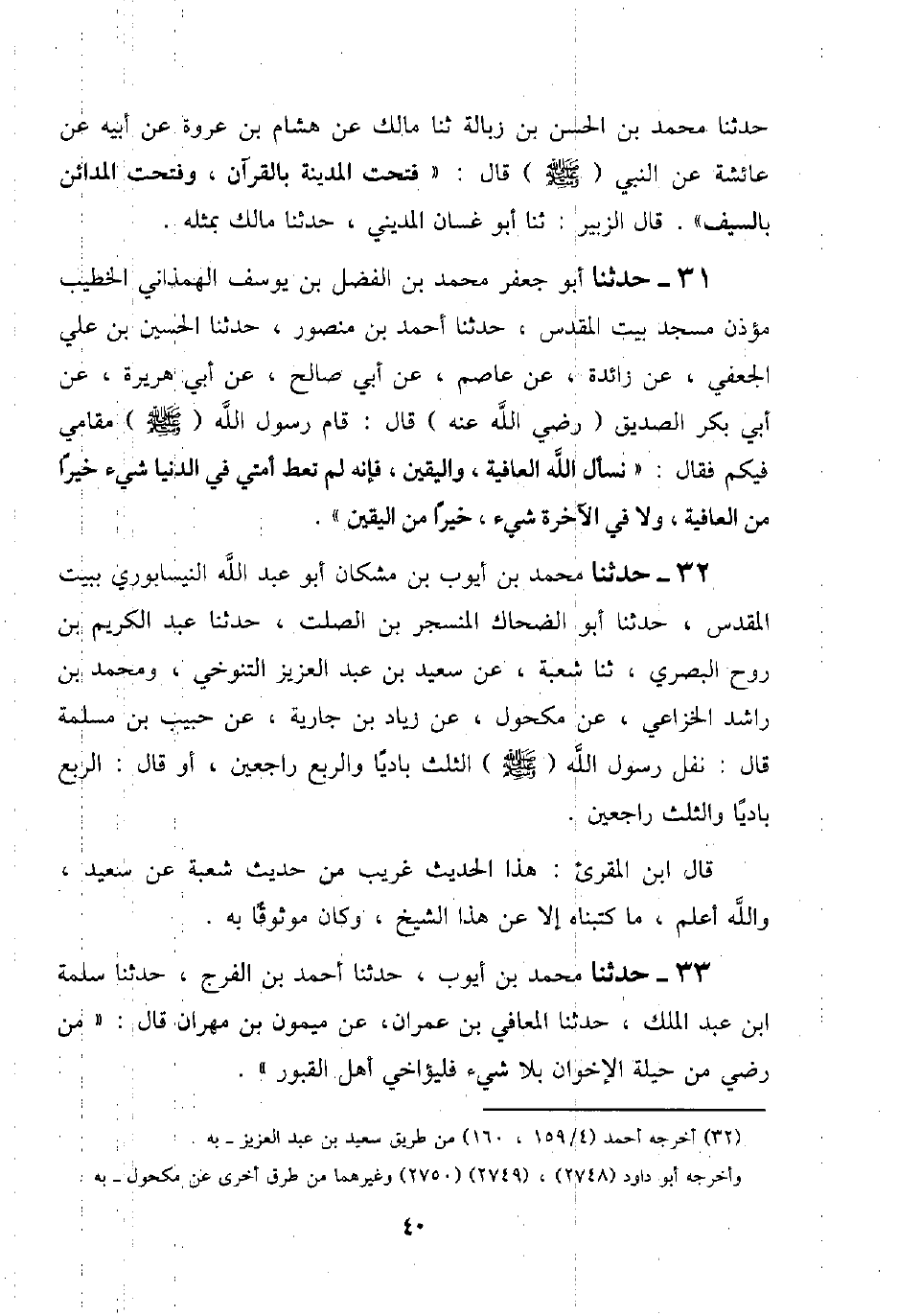30 - حَدَّثَنَا مُحَمَّدُ بْنُ أَيُّوبَ، حَدَّثَنَا أَحْمَدُ بْنُ الْفَرَجِ، حَدَّثَنَا سَلَمَةُ بْنُ عَبْدِ الْمَلِكِ، حَدَّثَنَا الْمُعَافَى بْنُ عِمْرَانَ، عَنْ مَيْمُونِ بْنِ مِهْرَانَ قَالَ: «§مَنْ رَضِيَ مِنْ حِيلَةِ الْإِخْوَانِ بِلَا شَيْءٍ فَلْيُؤَاخِ أَهْلَ الْقُبُورِ»