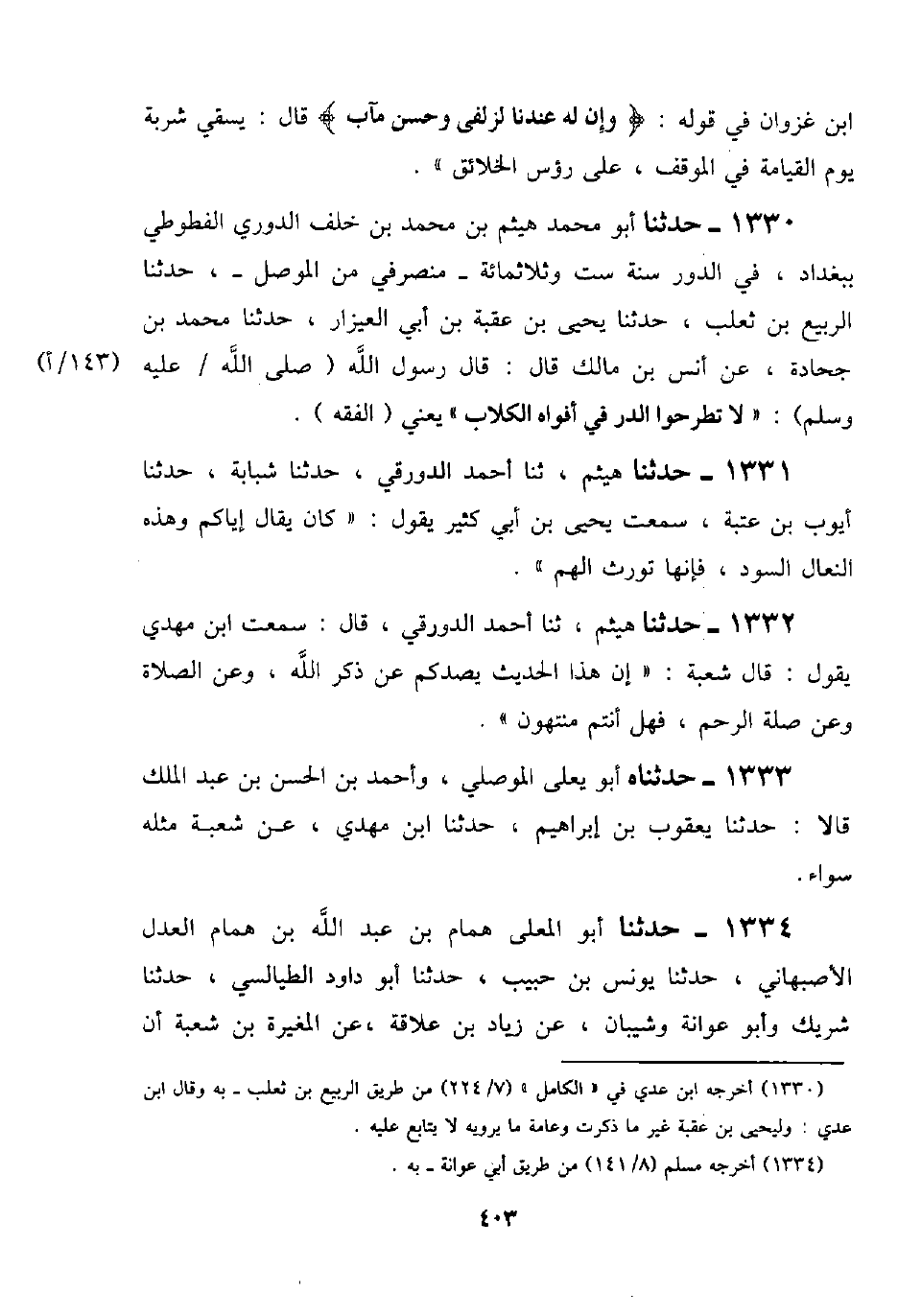 1313 - حَدَّثَنَا أَبُو مُحَمَّدٍ هَيْثَمُ بْنُ مُحَمَّدِ بْنِ خَلَفٍ الدُّورِيُّ الْفَطُّوطِيُّ بِبَغْدَادَ، فِي الدُّورِ سَنَةَ سِتٍّ وَثَلَاثِمِائَةٍ مُنْصَرَفِي مِنَ الْمَوْصِلِ، حَدَّثَنَا الرَّبِيعُ بْنُ ثَعْلَبٍ , حَدَّثَنَا يَحْيَى بْنُ عُقْبَةَ بْنِ أَبِي الْعَيْزَارِ، حَدَّثَنَا مُحَمَّدُ بْنُ جُحَادَةَ، عَنْ أَنَسِ بْنِ مَالِكٍ قَالَ: قَالَ رَسُولُ اللَّهِ صَلَّى اللَّهُ عَلَيْهِ وَسَلَّمَ «§لَا تَطْرَحُوا الدُّرَّ فِي أَفْوَاهِ الْكِلَابِ» يَعْنِي الْفِقْهَ
