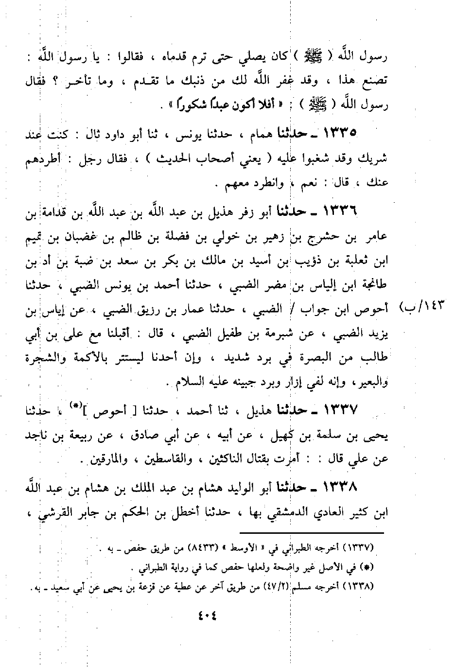 1318 - حَدَّثَنَا أَبُو زُفَرَ هُذَيْلُ بْنُ عَبْدِ اللَّهِ بْنِ عَبْدِ اللَّهِ بْنِ قُدَامَةَ بْنِ عَامِرِ بْنِ حَشْرَجِ بْنِ زُهَيْرِ بْنِ خَوْلِيِّ بْنِ فَضْلَةَ بْنِ ظَالِمِ بْنِ غَضْبَانَ بْنِ تَمِيمِ بْنِ ثَعْلَبَةَ بْنِ ذُؤَيْبِ بْنِ أُسَيْدِ بْنِ مَالِكِ بْنِ بَكْرِ بْنِ سَعْدِ بْنِ ضَبَّةَ بْنِ أَدِّ بْنِ طَانِجَةَ بْنِ إِلْيَاسَ بْنِ مُضَرَ الضَّبِّيُّ، حَدَّثَنَا أَحْمَدُ بْنُ يُونُسَ الضَّبِّيُّ، حَدَّثَنَا أَحْوَصُ بْنُ جَوَّابٍ الضَّبِّيُّ، حَدَّثَنَا عَمَّارُ بْنُ رُزَيْقٍ الضَّبِّيُّ، عَنْ إِيَاسِ بْنِ يَزِيدَ الضَّبِّيِّ، عَنْ شُبْرُمَةَ بْنِ طُفَيْلٍ الضَّبِّيِّ قَالَ: «أَقْبَلْنَا مَعَ عَلِيِّ بْنِ أَبِي طَالِبٍ مِنَ الْبَصْرَةِ فِي بَرْدٍ شَدِيدٍ، وَإِنَّ أَحَدَنَا لَيَسْتَتِرُ بِالْأَكْمَةِ وَالشَّجَرَةِ وَالْبَعِيرِ، §وَإِنَّهُ لَفِي إِزَارٍ وَبَرَدَ جَبِينُهُ عَلَيْهِ السَّلَامُ»