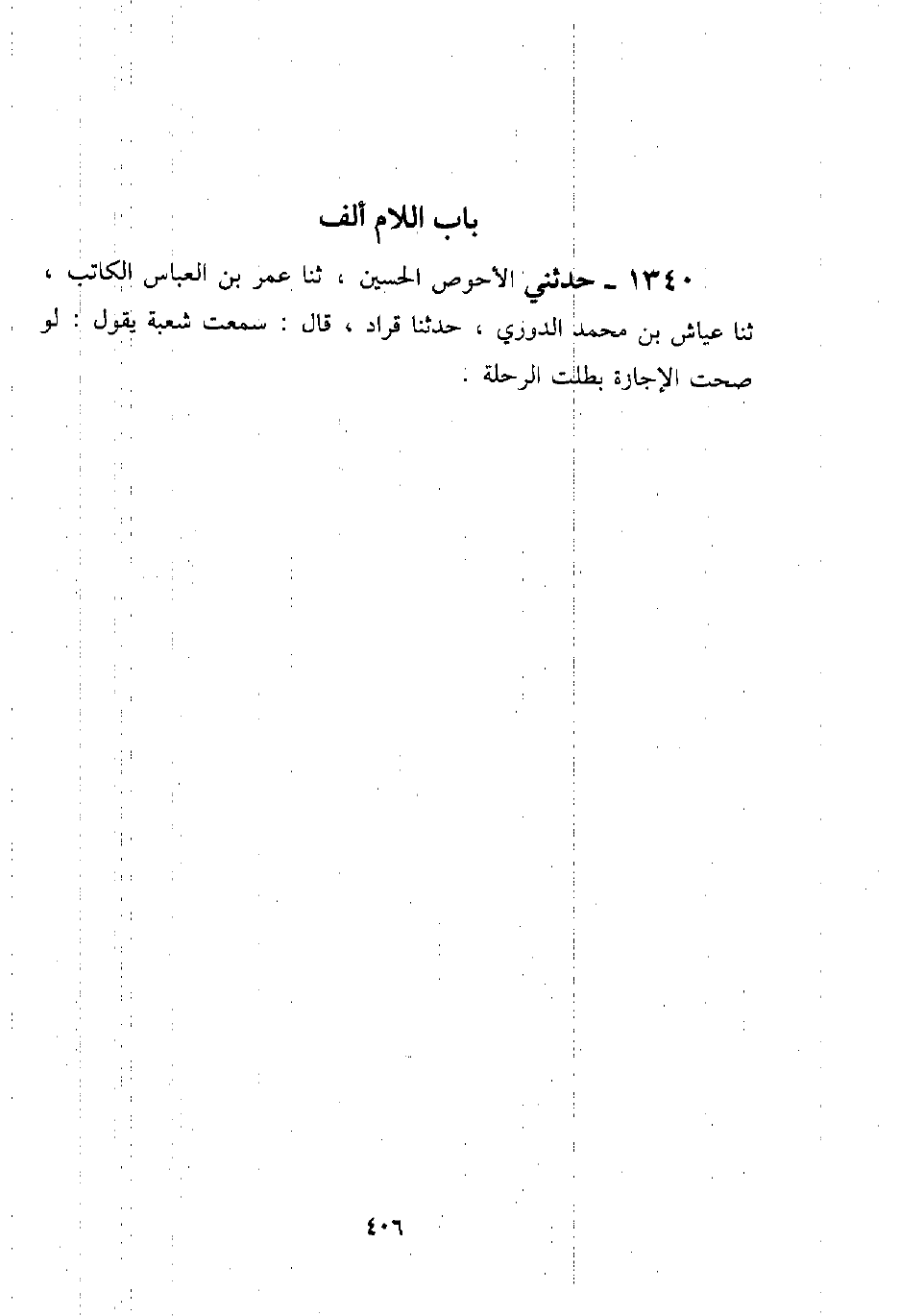1322 - حَدَّثَنِي الْأَحْوَصُ الْحُسَيْنُ، ثنا عُمَرُ بْنُ الْعَبَّاسِ الْكَاتِبُ، ثنا عَبَّاسُ بْنُ مُحَمَّدٍ الدُّورِيُّ، حَدَّثَنَا قُرَادٌ قَالَ: سَمِعْتُ شُعْبَةَ يَقُولُ: «§لَوْ صَحَّتِ الْإِجَازَةُ بَطُلَتِ الرِّحْلَةُ»