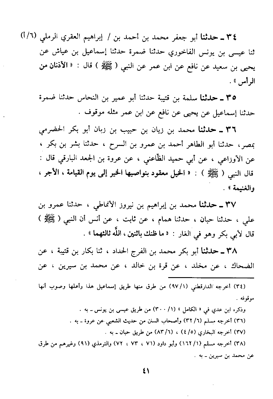 32 - حَدَّثَنَا مُحَمَّدُ بْنُ زَيَّانَ بْنِ حَبِيبِ بْنِ زَبَّانَ أَبُو بَكْرٍ الْحَضْرَمِيُّ بِمِصْرَ، حَدَّثَنَا أَبُو الطَّاهِرِ أَحْمَدُ بْنُ عَمْرِو بْنِ السَّرْحِ، حَدَّثَنَا بِشْرُ بْنُ بَكْرٍ، عَنِ الْأَوْزَاعِيِّ، عَنْ أَبِي حُمَيْدٍ الظَّاعِنِيِّ، عَنْ عُرْوَةَ بْنِ أَبِي الْجَعْدِ الْبَارِقِيِّ قَالَ: قَالَ النَّبِيُّ صَلَّى اللَّهُ عَلَيْهِ وَسَلَّمَ: «§الْخَيْلُ مَعْقُودٌ بِنَوَاصِيهَا الْخَيْرُ إِلَى يَوْمِ الْقِيَامَةِ، الْأَجْرُ، وَالْغَنِيمَةُ»