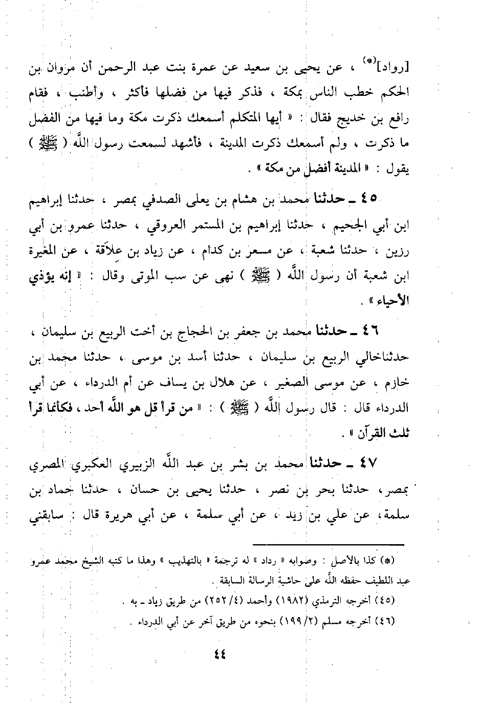 43 - حَدَّثَنَا مُحَمَّدُ بْنُ جَعْفَرِ بْنِ الْحَجَّاجِ ابْنِ أُخْتِ الرَّبِيعِ بْنِ سُلَيْمَانَ، حَدَّثَنَا خَالِي الرَّبِيعُ بْنُ سُلَيْمَانَ، حَدَّثَنَا أَسَدُ بْنُ مُوسَى، حَدَّثَنَا مُحَمَّدُ بْنُ خَازِمٍ، عَنْ مُوسَى الصَّغِيرِ، عَنْ هِلَالِ بْنِ يَسَافٍ، عَنْ أُمِّ الدَّرْدَاءِ، عَنْ أَبِي الدَّرْدَاءِ قَالَ: قَالَ رَسُولُ اللَّهِ صَلَّى اللَّهُ عَلَيْهِ وَسَلَّمَ: " §مَنْ قَرَأَ {قُلْ هُوَ اللَّهُ أَحَدٌ} [الإخلاص: 1] فَكَأَنَّمَا قَرَأَ ثُلُثَ الْقُرْآنِ "