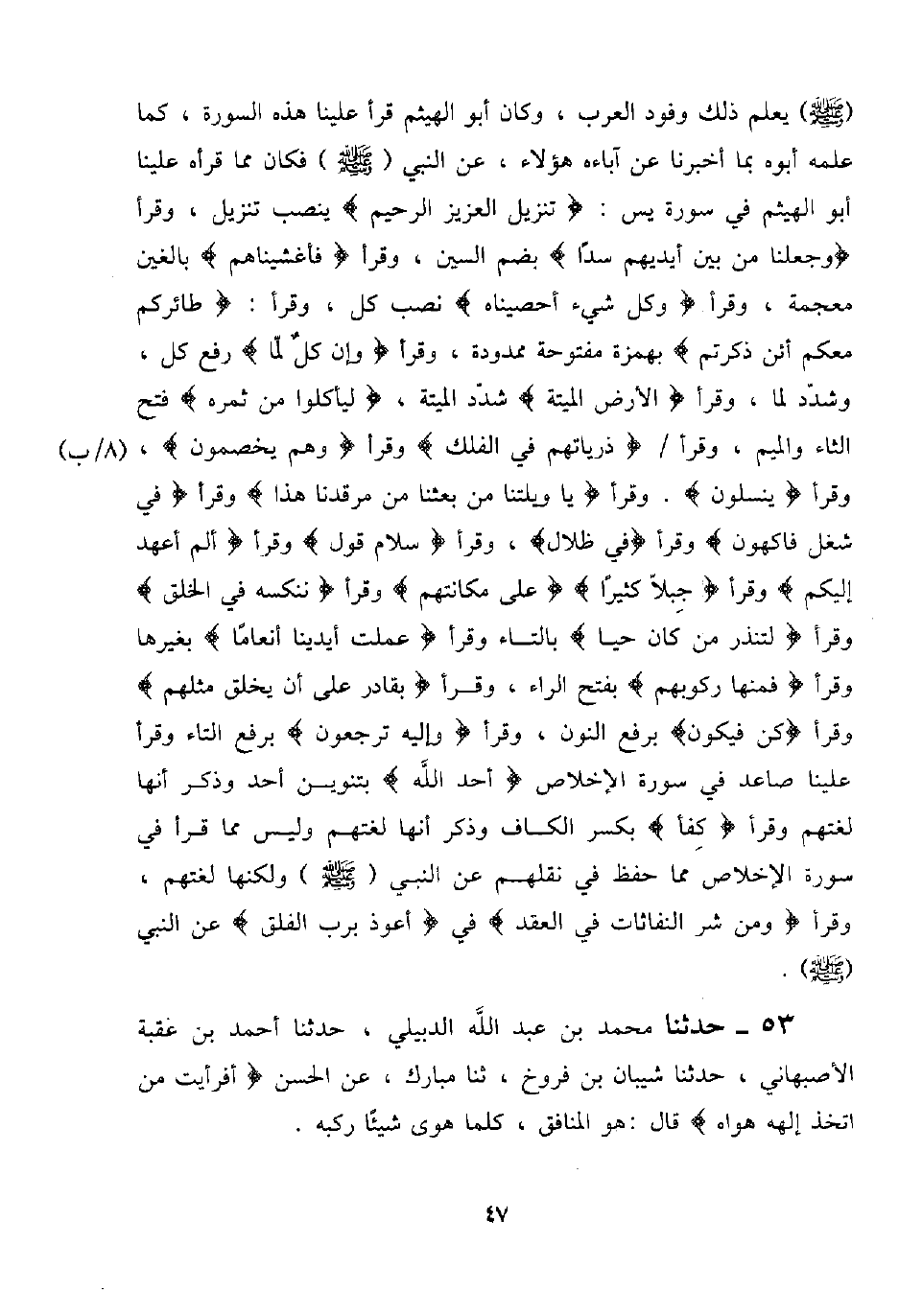 50 - حَدَّثَنَا مُحَمَّدُ بْنُ عَبْدِ اللَّهِ الدَّبِيلِيُّ، حَدَّثَنَا أَحْمَدُ بْنُ عُقْبَةَ الْأَصْبَهَانِيُّ، حَدَّثَنَا شَيْبَانُ بْنُ فَرُّوخَ، ثنا مُبَارَكٌ، عَنِ الْحَسَنِ، {أَفَرَأَيْتَ مَنِ اتَّخَذَ إِلَهَهُ هَوَاهُ} [الجاثية: 23] قَالَ: هُوَ §الْمُنَافِقُ، كُلَّمَا هَوَى شَيْئًا رَكِبَهُ