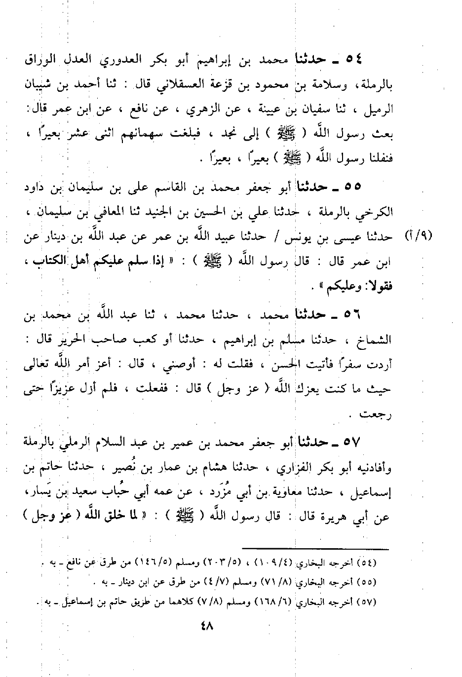 51 - حَدَّثَنَا مُحَمَّدُ بْنُ إِبْرَاهِيمَ أَبُو بَكْرٍ الْعَدُورِيُّ الْعَدْلُ الْوَرَّاقُ بِالرَّمْلَةِ، وَسَلَامَةُ بْنُ مَحْمُودِ بْنِ قَزَعَةَ الْعَسْقَلَانِيُّ قَالَ: ثنا أَحْمَدُ بْنُ شَيْبَانَ الرَّمْلِيُّ، ثنا سُفْيَانُ بْنُ عُيَيْنَةَ، عَنِ الزُّهْرِيِّ، عَنْ نَافِعٍ، عَنِ ابْنِ عُمَرَ قَالَ: §بَعَثَ رَسُولُ اللَّهِ صَلَّى اللَّهُ عَلَيْهِ وَسَلَّمَ إِلَى نَجْدٍ فَبَلَغَتْ سُهْمَانُهُمُ اثْنَيْ عَشَرَ بَعِيرًا، فَنَفَّلَنَا رَسُولُ اللَّهِ صَلَّى اللَّهُ عَلَيْهِ وَسَلَّمَ بَعِيرًا، بَعِيرًا