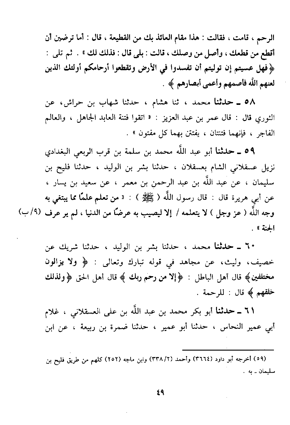 56 - حَدَّثَنَا أَبُو عَبْدِ اللَّهِ مُحَمَّدُ بْنُ سَلَمَةَ بْنِ قُرْبٍ الرَّبَعِيُّ الْبَغْدَادِيُّ نَزِيلُ عَسْقَلَانِ الشَّامِ بِعَسْقَلَانَ، حَدَّثَنَا بِشْرُ بْنُ الْوَلِيدِ، حَدَّثَنَا فُلَيْحُ بْنُ سُلَيْمَانَ، عَنْ عَبْدِ اللَّهِ بْنِ عَبْدِ الرَّحْمَنِ بْنِ مَعْمَرٍ، عَنْ سَعِيدِ بْنِ يَسَارٍ، عَنْ أَبِي هُرَيْرَةَ قَالَ: قَالَ رَسُولُ اللَّهِ صَلَّى اللَّهُ عَلَيْهِ وَسَلَّمَ: «§مَنْ تَعَلَّمَ عِلْمًا مِمَّا يُبْتَغَى بِهِ وَجْهُ اللَّهِ عَزَّ وَجَلَّ لَا يَتَعَلَّمُهُ إِلَّا لِيُصِيبَ بِهِ عَرَضًا مِنَ الدُّنْيَا ـ لَمْ يَرَ عَرْفَ الْجَنَّةِ»