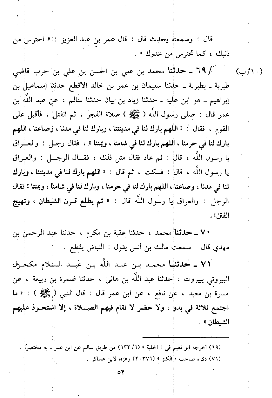 66 - حَدَّثَنَا مُحَمَّدُ بْنُ عَلِيِّ بْنِ الْحَسَنِ بْنِ عَلِيِّ بْنِ حَرْبٍ، قَاضِي طَبَرِيَّةَ بِطَبَرِيَّةَ حَدَّثَنَا سُلَيْمَانُ بْنُ عُمَرَ بْنِ خَالِدٍ الْأَقْطَعُ، حَدَّثَنَا إِسْمَاعِيلُ بْنُ إِبْرَاهِيمَ، هُوَ ابْنُ عُلَيَّةَ حَدَّثَنَا زِيَادُ بْنُ بَيَانٍ، حَدَّثَنَا سَالِمٌ، عَنْ عَبْدِ اللَّهِ بْنِ عُمَرَ قَالَ: صَلَّى رَسُولُ اللَّهِ صَلَّى اللَّهُ عَلَيْهِ وَسَلَّمَ صَلَاةَ الْفَجْرِ، ثُمَّ انْفَتَلَ، فَأَقْبَلَ عَلَى الْقَوْمِ، فَقَالَ: «اللَّهُمَّ §بَارِكْ لَنَا فِي مَدِينَتِنَا، وَبَارِكْ لَنَا فِي مُدِّنَا، وَصَاعِنَا، اللَّهُمَّ بَارِكْ لَنَا فِي حَرَمِنَا، اللَّهُمَّ بَارِكْ لَنَا فِي شَامِنَا وَيَمَنِنَا» ، فَقَالَ رَجُلٌ: وَالْعِرَاقِ يَا رَسُولَ اللَّهِ قَالَ: ثُمَّ عَادَ فَقَالَ مِثْلَ ذَلِكَ، فَقَالَ الرَّجُلُ: وَالْعِرَاقِ يَا رَسُولَ اللَّهِ، قَالَ: فَسَكَتَ، ثُمَّ قَالَ: «اللَّهُمَّ بَارِكْ لَنَا فِي مَدِينَتِنَا، وَبَارِكْ لَنَا فِي مُدِّنَا وَصَاعِنَا، اللَّهُمَّ بَارِكْ لَنَا فِي حَرَمِنَا، وَبَارِكْ لَنَا فِي شَامِنَا وَيَمَنِنَا» فَقَالَ الرَّجُلُ: وَالْعِرَاقِ يَا رَسُولَ اللَّهِ. قَالَ: «ثَمَّ يَطْلُعُ قَرْنُ الشَّيْطَانِ، وَتَهِيجُ الْفِتَنُ»