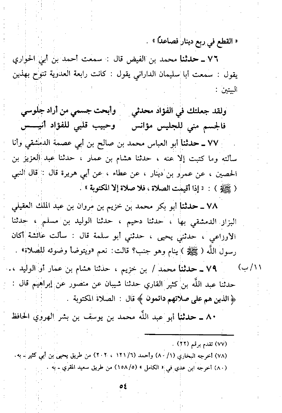 73 - حَدَّثَنَا مُحَمَّدُ بْنُ الْفَيْضِ قَالَ: سَمِعْتُ أَحْمَدَ بْنَ أَبِي الْحَوَارِي يَقُولُ: سَمِعْتُ أَبَا سُلَيْمَانَ الدَّارَانِيَّ يَقُولُ: كَانَتْ رَابِعَةُ الْعَدَوِيَّةُ تَنُوحُ بِهَذَيْنِ الْبَيْتَيْنِ: