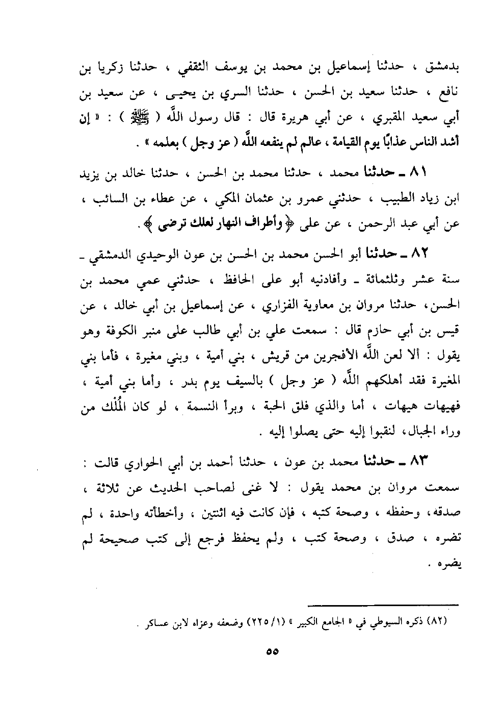 80 - حَدَّثَنَا مُحَمَّدُ بْنُ عَوْنٍ، حَدَّثَنَا أَحْمَدُ بْنُ أَبِي الْحَوَارِي قَالَ: سَمِعْتُ مَرْوَانَ بْنَ مُحَمَّدٍ يَقُولُ: " §لَا غِنًى لِصَاحِبِ الْحَدِيثِ عَنْ ثَلَاثَةٍ: صِدْقِهِ، وَحَفِظِهِ، وَصِحَّةِ كُتُبِهِ، فَإِنْ كَانَتْ فِيهِ اثْنَتَيْنِ وَأَخْطَأَتْهُ وَاحِدَةٌ لَمْ تَضُرَّهُ، صِدْقٌ وَصِحَّةُ كُتُبٍ، وَلَمْ يَحْفَظْ فَرَجَعَ إِلَى كُتُبٍ صَحِيحَةٍ لَمْ يَضُرَّهُ "
