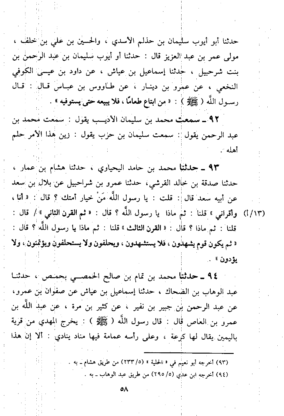89 - حَدَّثَنَا مُحَمَّدُ بْنُ حَامِدٍ الْيَحْيَاوِيُّ، حَدَّثَنَا هِشَامُ بْنُ عَمَّارٍ، حَدَّثَنَا صَدَقَةُ بْنُ خَالِدٍ الْقُرَشِيُّ، حَدَّثَنَا عَمْرُو بْنُ شُرَاحْبِيلَ، عَنْ بِلَالِ بْنِ سَعْدٍ، عَنْ أَبِيهِ سَعْدٍ قَالَ: قُلْتُ: يَا رَسُولَ اللَّهِ: §مَنْ خِيَارُ أُمَّتِكَ؟ قَالَ: «أَنَا وَأَقْرَانِي» قُلْنَا: ثُمَّ مَاذَا يَا رَسُولَ اللَّهِ؟ قَالَ: «ثُمَّ الْقَرْنُ الثَّانِي» قَالَ: قُلْنَا: ثُمَّ مَاذَا؟ قَالَ: «الْقَرْنُ الثَّالِثُ» قُلْنَا: ثُمَّ مَاذَا يَا رَسُولَ اللَّهِ؟ قَالَ: «ثُمَّ يَكُونُ قَوْمٌ يَشْهَدُونَ وَلَا يُسْتَشْهَدُونَ، وَيَحْلِفُونَ وَلَا يُسْتَحْلَفُونَ، وَيُؤْتَمَنُونَ وَلَا يُؤَدُّونَ»