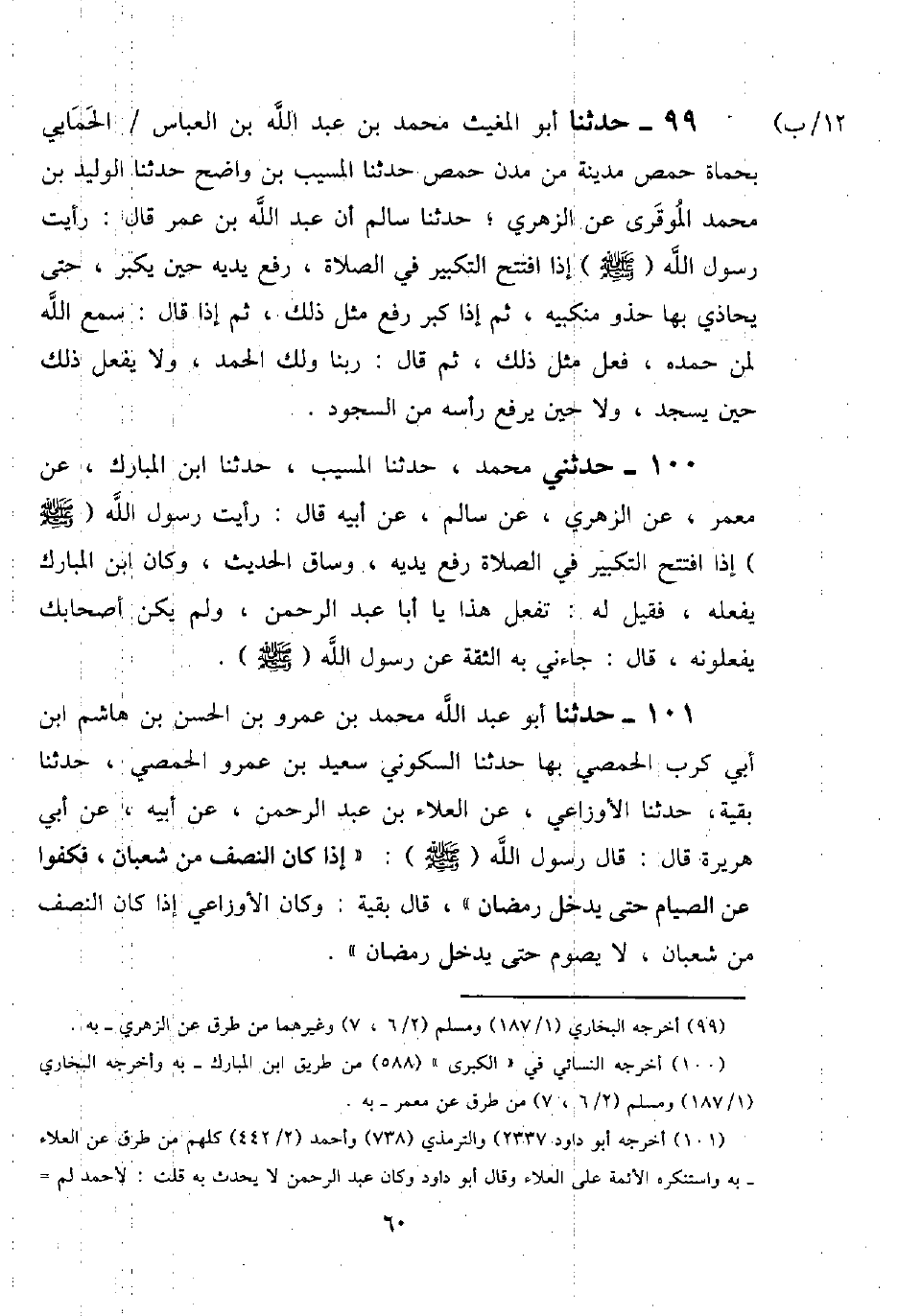 95 - حَدَّثَنَا أَبُو الْمُغِيثِ مُحَمَّدُ بْنُ عَبْدِ اللَّهِ بْنِ الْعَبَّاسِ الْحَمَايِيُّ بِحَمَاةَ حِمْصَ مَدِينَةٍ مِنْ مُدُنِ حِمْصَ حَدَّثَنَا الْمُسَيَّبُ بْنُ وَاضِحٍ حَدَّثَنَا الْوَلِيدُ بْنُ مُحَمَّدٍ الْمُوَقَّرِيُّ عَنِ الزُّهْرِيِّ , حَدَّثَنَا سَالِمٌ أَنَّ عَبْدَ اللَّهِ بْنَ عُمَرَ قَالَ: رَأَيْتُ رَسُولَ اللَّهِ صَلَّى اللَّهُ عَلَيْهِ وَسَلَّمَ §إِذَا افْتَتَحَ التَّكْبِيرَ فِي الصَّلَاةِ رَفَعَ يَدَيْهِ حِينَ يُكَبِّرُ، حَتَّى يُحَاذِيَ بِهَا حَذْوَ مَنْكِبَيْهِ، ثُمَّ إِذَا كَبَّرَ رَفَعَ مِثْلَ ذَلِكَ، ثُمَّ إِذَا قَالَ: «سَمِعَ اللَّهَ لِمَنْ حَمِدَهُ» ، فَعَلَ مِثْلَ ذَلِكَ، ثُمَّ قَالَ: «رَبَّنَا وَلَكَ الْحَمْدُ» ، وَلَا يَفْعَلُ ذَلِكَ حِينَ يَسْجُدُ، وَلَا حِينَ يَرْفَعُ رَأْسَهُ مِنَ السُّجُودِ. حَدَّثَنِي مُحَمَّدٌ، حَدَّثَنَا الْمُسَيَّبُ، حَدَّثَنَا ابْنُ الْمُبَارَكِ، عَنْ مَعْمَرٍ، عَنِ الزُّهْرِيِّ، عَنْ سَالِمٍ، عَنْ أَبِيهِ قَالَ: رَأَيْتُ رَسُولَ اللَّهِ صَلَّى اللَّهُ عَلَيْهِ وَسَلَّمَ إِذَا افْتَتَحَ التَّكْبِيرَ فِي الصَّلَاةِ رَفَعَ يَدَيْهِ، وَسَاقَ الْحَدِيثَ، وَكَانَ ابْنُ الْمُبَارَكِ يَفْعَلُهُ، فَقِيلَ لَهُ: تَفْعَلُ هَذَا يَا أَبَا عَبْدِ الرَّحْمَنِ، وَلَمْ يَكُنْ أَصْحَابُكَ يَفْعَلُونَهُ قَالَ: جَاءَنِي بِهِ الثِّقَةُ عَنْ رَسُولِ اللَّهِ صَلَّى اللَّهُ عَلَيْهِ وَسَلَّمَ