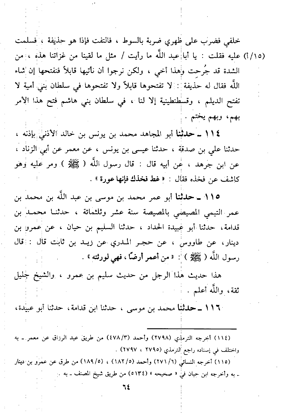 107 - حَدَّثَنَا أَبُو الْمُجَاهِدِ مُحَمَّدُ بْنُ يُونُسَ بْنِ خَالِدٍ الْأَذَنِيُّ بِأَذَنَةَ حَدَّثَنَا عَلِيُّ بْنُ صَدَقَةَ، حَدَّثَنَا عِيسَى بْنُ يُونُسَ، عَنْ مَعْمَرٍ، عَنْ أَبِي الزِّنَادِ، عَنِ ابْنِ جَرْهَدٍ، عَنْ أَبِيهِ قَالَ: قَالَ رَسُولُ اللَّهِ صَلَّى اللَّهُ عَلَيْهِ وَسَلَّمَ وَمَرَّ عَلَيْهِ وَهُوَ كَاشِفٌ عَنْ فَخِذِهِ فَقَالَ: «§غَطِّ فَخِذَكَ فَإِنَّهَا عَوْرَةٌ»