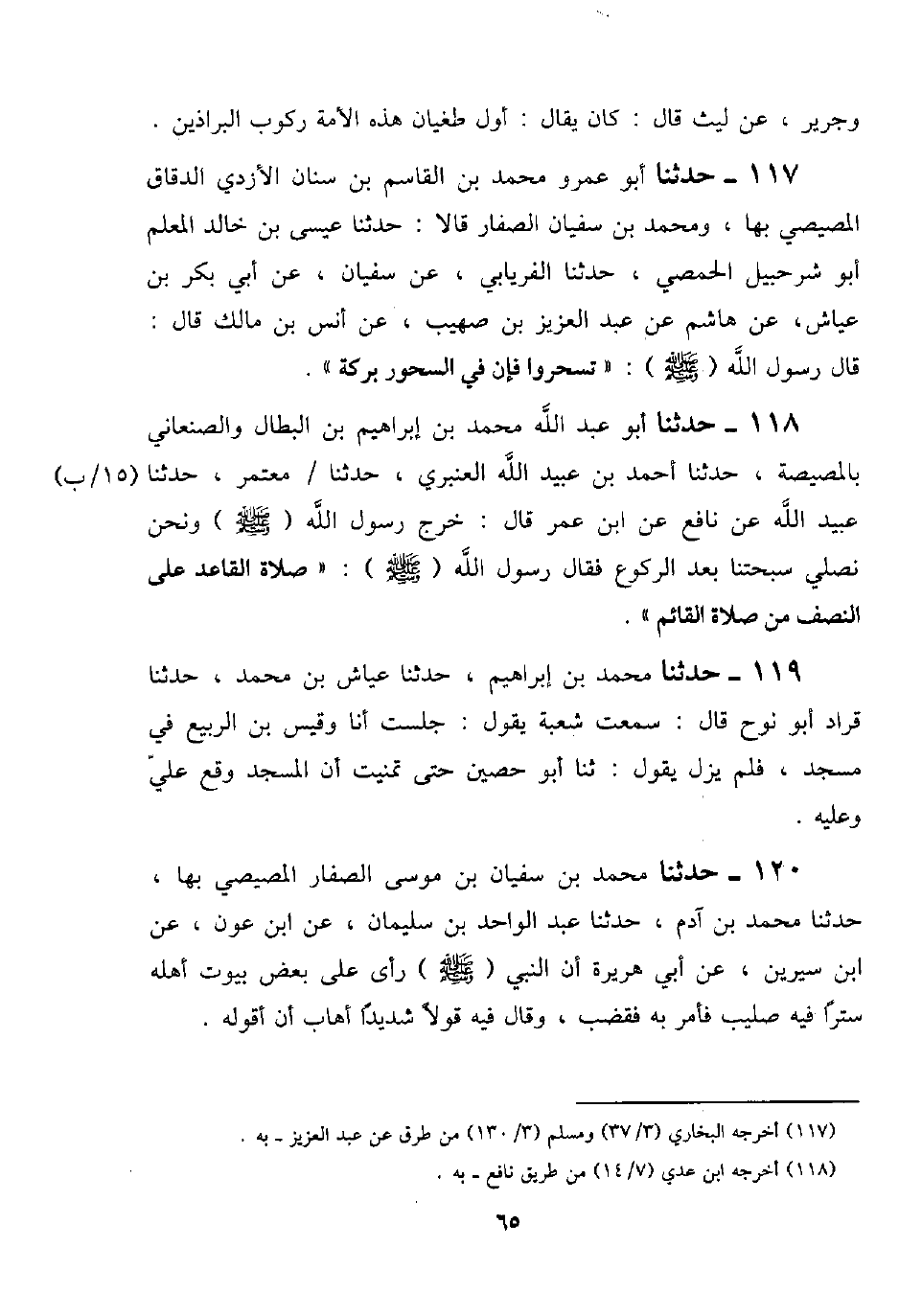 110 - حَدَّثَنَا أَبُو عَمْرٍو مُحَمَّدُ بْنُ الْقَاسِمِ بْنِ سِنَانٍ الْأَزْدِيُّ الدَّقَّاقُ الْمِصِّيصِيُّ بِهَا، وَمُحَمَّدُ بْنُ سُفْيَانَ الصَّفَّارُ قَالَا: حَدَّثَنَا عِيسَى بْنُ خَالِدٍ الْمُعَلِّمُ أَبُو شُرَحْبِيلَ الْحِمْصِيُّ، حَدَّثَنَا الْفِرْيَابِيُّ، عَنْ سُفْيَانَ، عَنْ أَبِي بَكْرِ بْنِ عَيَّاشٍ، عَنْ هَاشِمٍ، عَنْ عَبْدِ الْعَزِيزِ بْنِ صُهَيْبٍ , عَنْ أَنَسِ بْنِ مَالِكٍ قَالَ: قَالَ رَسُولُ اللَّهِ صَلَّى اللَّهُ عَلَيْهِ وَسَلَّمَ: «§تَسَحَّرُوا فَإِنَّ فِي السَّحُورِ بَرَكَةً»