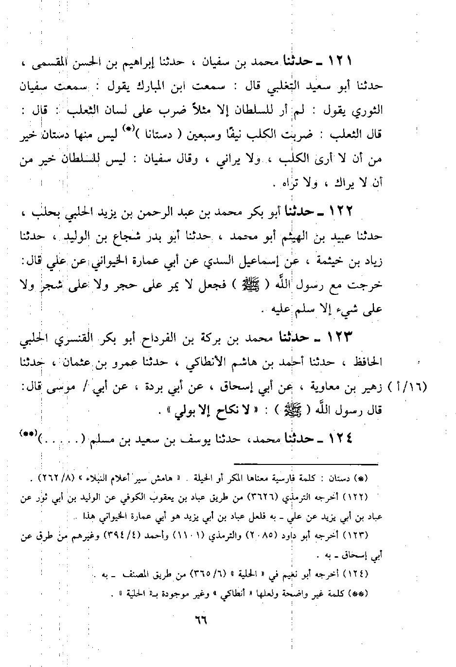 115 - حَدَّثَنَا مُحَمَّدُ بْنُ بَرَكَةَ بْنِ الْفِرْدَاحِ أَبُو بَكْرٍ الْقَنْسَرِيُّ الْحَلَبِيُّ الْحَافِظُ، حَدَّثَنَا أَحْمَدُ بْنُ هَاشِمٍ الْأَنْطَاكِيُّ، حَدَّثَنَا عَمْرُو بْنُ عُثْمَانَ، حَدَّثَنَا زُهَيْرُ بْنُ مُعَاوِيَةَ، عَنْ أَبِي إِسْحَاقَ، عَنْ أَبِي بُرْدَةَ، عَنْ أَبِي مُوسَى قَالَ: قَالَ رَسُولُ اللَّهِ صَلَّى اللَّهُ عَلَيْهِ وَسَلَّمَ: «§لَا نِكَاحَ إِلَّا بِوَلِيٍّ»