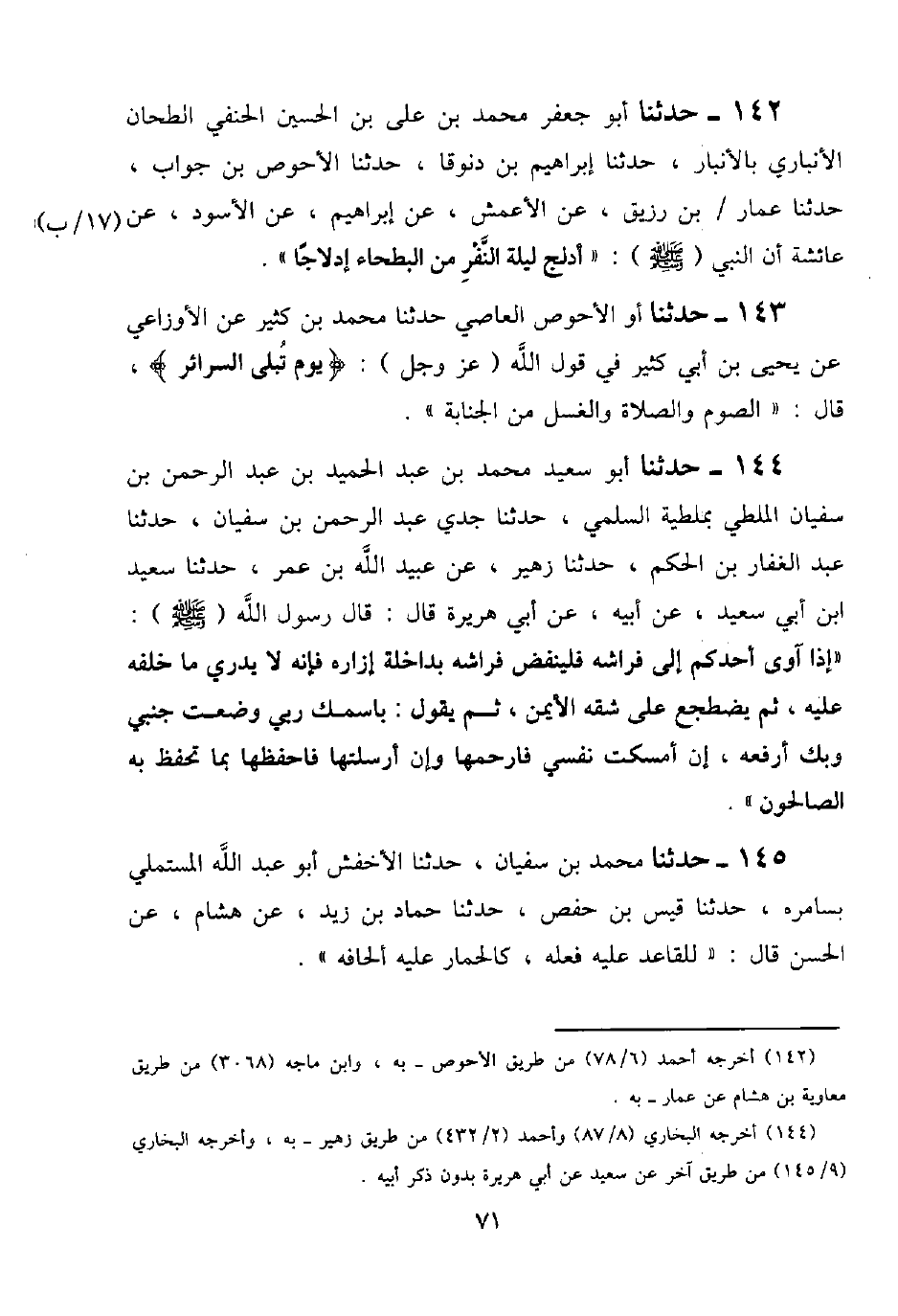 134 - حَدَّثَنَا أَبُو سَعِيدٍ مُحَمَّدُ بْنُ عَبْدِ الْحَمِيدِ بْنِ عَبْدِ الرَّحْمَنِ بْنِ سُفْيَانَ الْمَلَطِيُّ بِمَلَطِيَّةِ السُّلَمِيُّ، حَدَّثَنَا جَدِّي عَبْدُ الرَّحْمَنِ بْنُ سُفْيَانَ، حَدَّثَنَا عَبْدُ الْغَفَّارِ بْنُ الْحَكَمِ، حَدَّثَنَا زُهَيْرٌ، عَنْ عُبَيْدِ اللَّهِ بْنِ عُمَرَ، حَدَّثَنَا سَعِيدُ بْنُ أَبِي سَعِيدٍ، عَنْ أَبِيهِ عَنْ أَبِي هُرَيْرَةَ قَالَ: قَالَ رَسُولُ اللَّهِ صَلَّى اللَّهُ عَلَيْهِ وَسَلَّمَ: " §إِذَا آوَى أَحَدُكُمْ إِلَى فِرَاشِهِ فَلْيَنْفُضْ فِرَاشَهُ بِدَاخِلَةِ إِزَارِهِ فَإِنَّهُ لَا يَدْرِي مَا خَلَفَهُ عَلَيْهِ، ثُمَّ يَضْطَجِعْ عَلَى شِقِّهِ الْأَيْمَنِ، ثُمَّ يَقُولُ: بِاسْمِكَ رَبِّي وَضَعْتُ جَنْبِي وَبِكَ أَرْفَعُهُ، إِنْ أَمْسَكْتَ نَفْسِي فَارْحَمْهَا وَإِنْ أَرْسَلْتَهَا فَاحْفَظْهَا بِمَا تَحْفَظُ بِهِ الصَّالِحِينَ "