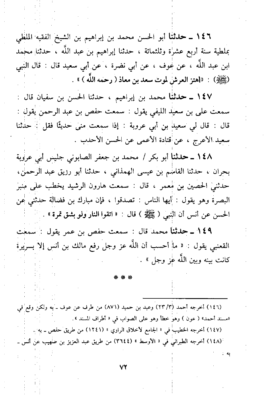 136 - حَدَّثَنَا أَبُو الْحَسَنِ مُحَمَّدُ بْنُ إِبْرَاهِيمَ بْنِ الشَّيْخِ الْفَقِيهُ الْمَلَطِيُّ بِمَلَطِيَّةِ سَنَةَ أَرْبَعَ عَشْرَةَ وَثَلَاثِمِائَةٍ , حَدَّثَنَا إِبْرَاهِيمُ بْنُ عَبْدِ اللَّهِ , حَدَّثَنَا مُحَمَّدُ بْنُ عَبْدِ اللَّهِ، عَنْ عَوْفٍ، عَنْ أَبِي نَضْرَةَ، عَنْ أَبِي سَعِيدٍ قَالَ: قَالَ النَّبِيُّ صَلَّى اللَّهُ عَلَيْهِ وَسَلَّمَ: «§اهْتَزَّ الْعَرْشُ لِمَوْتِ سَعْدِ بْنِ مُعَاذٍ رَحِمَهُ اللَّهُ» . حَدَّثَنَا مُحَمَّدُ بْنُ إِبْرَاهِيمَ، حَدَّثَنَا الْحَسَنُ بْنُ سُفْيَانَ قَالَ: سَمِعْتُ عَلِيَّ بْنَ سَعِيدٍ اللِّيفِيَّ يَقُولُ: سَمِعْتُ حَفْصَ بْنَ عَبْدِ الرَّحْمَنِ يَقُولُ: قَالَ: قَالَ لِي سَعِيدُ بْنُ أَبِي عَرُوبَةَ: إِذَا سَمِعْتَ مِنِّي حَدِيثًا فَقُلْ: حَدَّثَنَا سَعِيدٌ الْأَعْرَجُ، عَنْ قَتَادَةَ الْأَعْمَى عَنِ الْحَسَنِ الْأَحْدَبِ