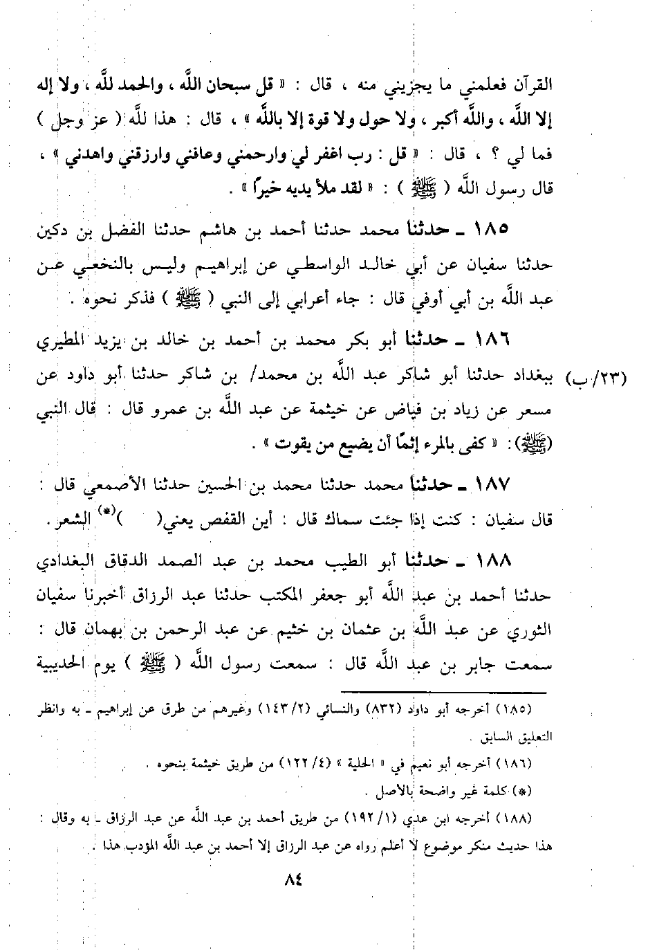 173 - حَدَّثَنَا أَبُو بَكْرٍ مُحَمَّدُ بْنُ أَحْمَدَ بْنِ خَالِدِ بْنِ يَزِيدَ الْمَطِيرِيُّ بِبَغْدَادَ حَدَّثَنَا أَبُو شَاكِرٍ عَبْدُ اللَّهِ بْنُ مُحَمَّدِ بْنِ شَاكِرٍ، حَدَّثَنَا أَبُو دَاوُدَ، عَنْ مِسْعَرٍ، عَنْ زِيَادِ بْنِ فَيَّاضٍ، عَنْ خَيْثَمَةَ، عَنْ عَبْدِ اللَّهِ بْنِ عَمْرٍو قَالَ: قَالَ النَّبِيُّ صَلَّى اللَّهُ عَلَيْهِ وَسَلَّمَ: «§كَفَى بِالْمَرْءِ إِثْمًا أَنْ يُضَيِّعَ مَنْ يَقُوتُ»