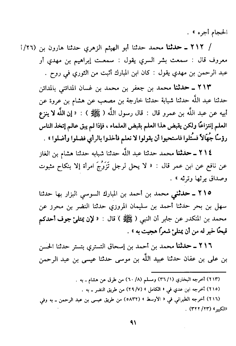 199 - حَدَّثَنَا مُحَمَّدُ بْنُ جَعْفَرِ بْنِ مُحَمَّدِ بْنِ غَسَّانَ الْمَدَائِنِيُّ، بِالْمَدَائِنِ حَدَّثَنَا عَبْدُ اللَّهِ، حَدَّثَنَا شَبَابَةُ، حَدَّثَنَا خَارِجَةُ بْنُ مُصْعَبِ، عَنْ هِشَامِ بْنِ عُرْوَةَ، عَنْ أَبِيهِ، عَنْ عَبْدِ اللَّهِ بْنِ عَمْرٍو قَالَ: قَالَ رَسُولُ اللَّهِ صَلَّى اللَّهُ عَلَيْهِ وَسَلَّمَ: «إِنَّ اللَّهَ §لَا يَنْزِعُ الْعِلْمَ انْتِزَاعًا وَلَكِنْ يَقْبِضُ هَذَا الْعِلْمَ بِقَبْضِ الْعُلَمَاءِ، فَإِذَا لَمْ يَبْقَ عَالِمٌ , اتَّخَذَ النَّاسُ رُءُوسًا جُهَّالًا , فَسُئِلُوا فَاسْتَحْيَوْا أَنْ يَقُولُوا لَا نَعْلَمُ، فَأَخَذُوا بِالرَّأْيِ فَضَلُّوا وَأَضَلُّوا»