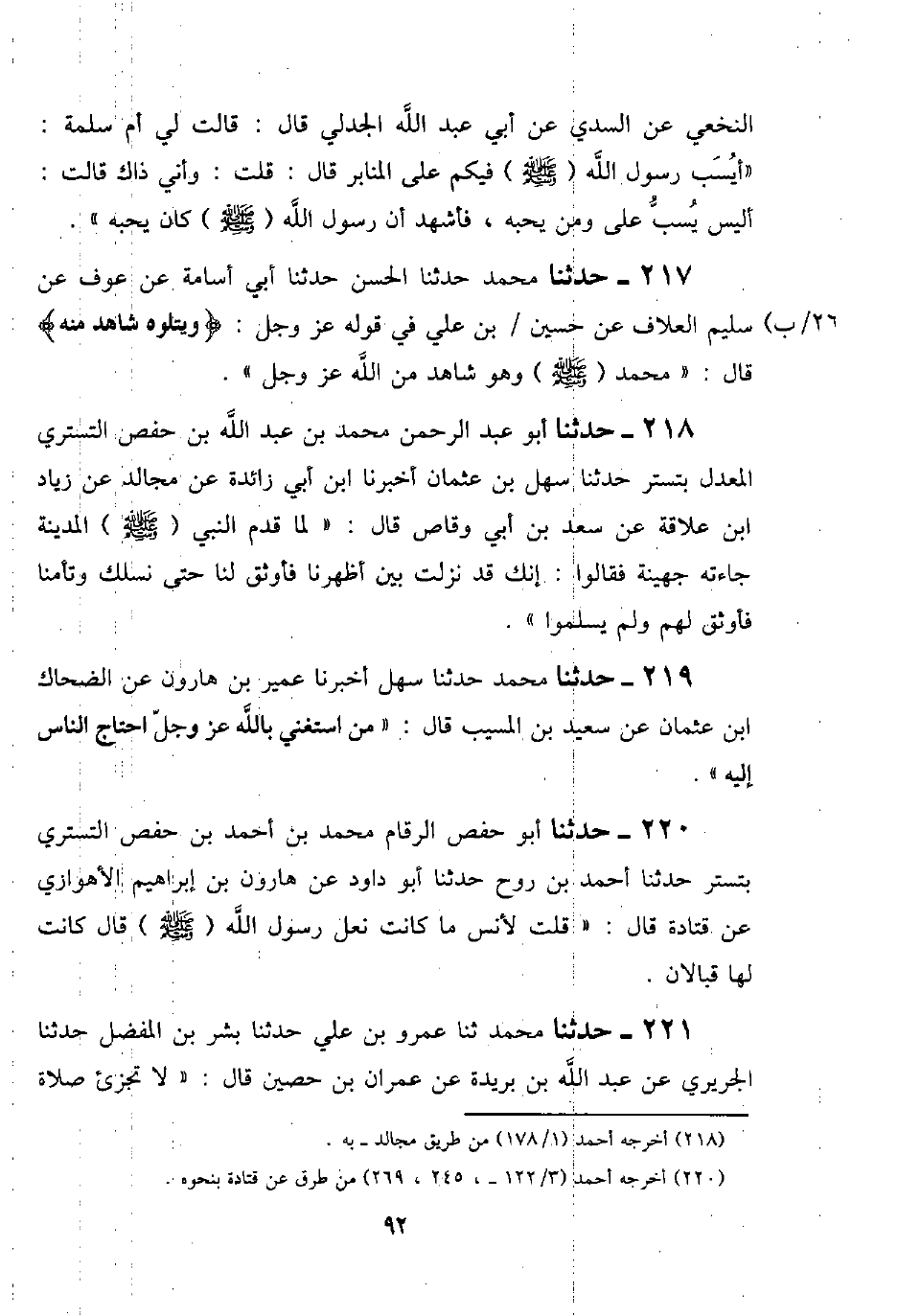 206 - حَدَّثَنَا أَبُو حَفْصٍ الرَّقَّامُ مُحَمَّدُ بْنُ أَحْمَدَ بْنِ حَفْصٍ التُّسْتَرِيُّ بِتُسْتَرَ حَدَّثَنَا أَحْمَدُ بْنُ رَوْحٍ، حَدَّثَنَا أَبُو دَاوُدَ، عَنْ هَارُونَ بْنِ إِبْرَاهِيمَ الْأَهْوَازِيِّ عَنْ قَتَادَةَ قَالَ: «قُلْتُ لِأَنَسٍ §مَا كَانَتْ نَعْلُ رَسُولِ اللَّهِ صَلَّى اللَّهُ عَلَيْهِ وَسَلَّمَ قَالَ كَانَتْ لَهَا قِبَالَانِ»