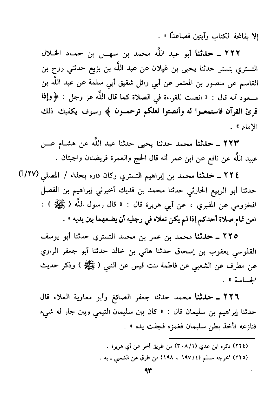 210 - حَدَّثَنَا مُحَمَّدُ بْنُ إِبْرَاهِيمَ التُّسْتَرِيُّ، وَكَانَ دَارُهُ بِحِذَاءِ الْمُصَلَّى، حَدَّثَنَا أَبُو الرَّبِيعِ الْحَارِثِيُّ، حَدَّثَنَا مُحَمَّدُ بْنُ فُدَيْكٍ، أَخْبَرَنِي إِبْرَاهِيمُ بْنُ الْفَضْلِ الْمَخْزُومِيُّ، عَنِ الْمَقْبُرِيِّ، عَنْ أَبِي هُرَيْرَةَ قَالَ: قَالَ رَسُولُ اللَّهِ صَلَّى اللَّهُ عَلَيْهِ وَسَلَّمَ: «§مِنْ تَمَامِ صَلَاةِ أَحَدِكُمْ إِذَا لَمْ يَكُنْ نَعْلَاهُ فِي رِجْلَيْهِ أَنْ يَضَعَهُمَا بَيْنَ يَدَيْهِ» . حَدَّثَنَا مُحَمَّدُ بْنُ عُمَرَ بْنِ مُحَمَّدٍ التُّسْتَرِيُّ، حَدَّثَنَا أَبُو يُوسُفَ الْقَلُوسِيُّ، يَعْقُوبُ بْنُ إِسْحَاقَ حَدَّثَنَا هَانِئُ بْنُ خَالِدٍ، حَدَّثَنَا أَبُو جَعْفَرٍ الرَّازِيُّ، عَنْ مُطَرِّفٍ، عَنِ الشَّعْبِيِّ، عَنْ فَاطِمَةَ بِنْتِ قَيْسٍ، عَنِ النَّبِيِّ صَلَّى اللَّهُ عَلَيْهِ وَسَلَّمَ وَذَكَرَ حَدِيثَ الْجَسَّاسَةِ