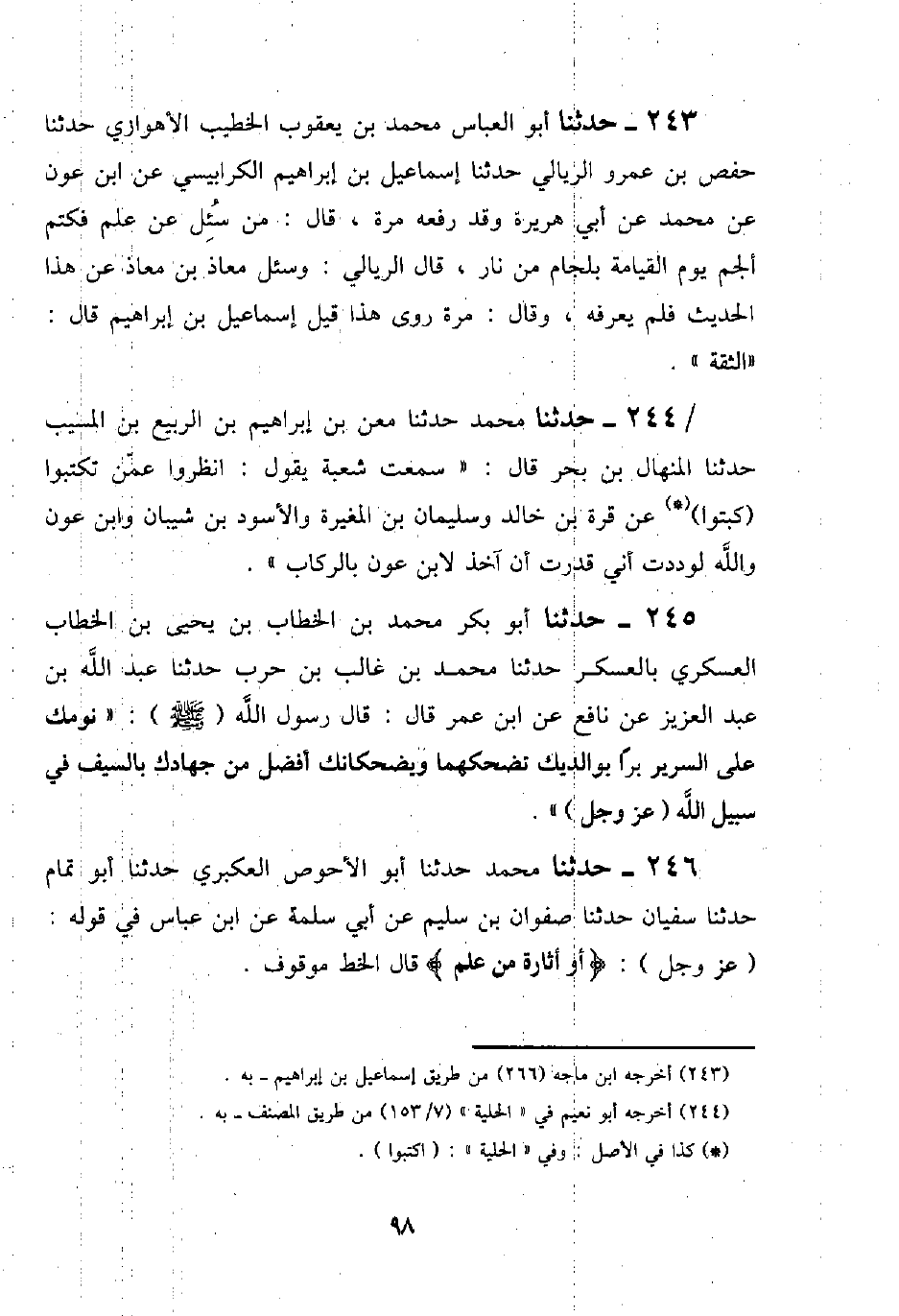 229 - حَدَّثَنَا أَبُو بَكْرٍ مُحَمَّدُ بْنُ الْخَطَّابِ بْنِ يَحْيَى بْنِ الْخَطَّابِ الْعَسْكَرِيُّ بِالْعَسْكَرِ حَدَّثَنَا مُحَمَّدُ بْنُ غَالِبِ بْنِ حَرْبٍ، حَدَّثَنَا عَبْدُ اللَّهِ بْنُ عَبْدِ الْعَزِيزِ، عَنْ نَافِعٍ، عَنِ ابْنِ عُمَرَ قَالَ: قَالَ رَسُولُ اللَّهِ صَلَّى اللَّهُ عَلَيْهِ وَسَلَّمَ: «§نَوْمُكُ عَلَى السَّرِيرِ بِرًّا بِوَالِدَيْكَ تُضْحِكُهُمَا وَيُضْحِكَانِكَ أَفْضَلُ مِنْ جِهَادِكَ بِالسَّيْفِ فِي سَبِيلِ اللَّهِ عَزَّ وَجَلَّ»