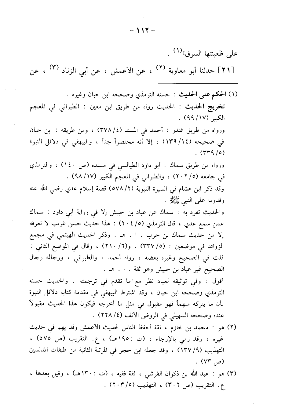 21 - حَدَّثَنَا أَبُو مُعَاوِيَةَ، عَنِ الْأَعْمَشِ، عَنْ أَبِي الزِّنَادِ، عَنِ -[113]- ابْنِ عُمَرَ قَالَ: «§لَقَدْ سُرَّ فِي ظِلِّ سَرْحَةٍ سَبْعُونَ نَبِيًّا لَمْ تَعْبَلْ وَلَمْ تَجَرِّدْ، وَلَمْ تُسْرَحْ»