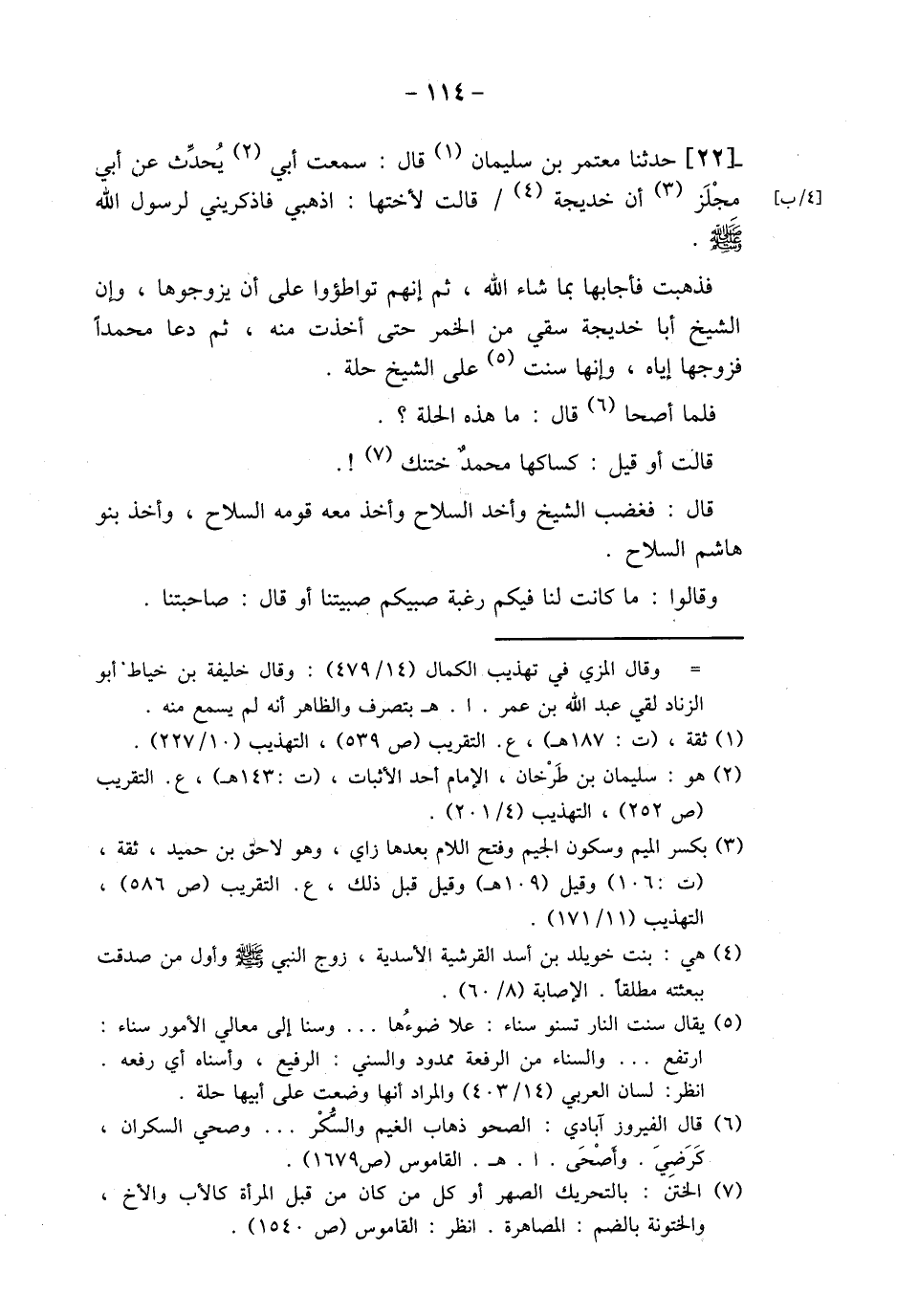 22 - حَدَّثَنَا مُعْتَمِرُ بْنُ سُلَيْمَانَ، قَالَ: سَمِعْتُ أَبِي يُحَدِّثُ، عَنْ أَبِي مِجْلَزٍ، " أَنَّ §خَدِيجَةَ قَالَتْ لِأُخْتِهَا: اذْهَبِي، فَاذْكُرِينِي لِرَسُولِ اللَّهِ صَلَّى اللهُ عَلَيْهِ وَسَلَّمَ، فَذَهَبَتْ، فَأَجَابَهَا بِمَا شَاءَ اللَّهُ، ثُمَّ إِنَّهُمْ تَوَاطَئُوا عَلَى أَنْ يُزَوِّجُوهَا، وَإِنَّ الشَّيْخَ أَبَا خَدِيجَةَ سُقِيَ مِنَ الْخَمْرِ حَتَّى أَخَذَتْ مِنْهُ، ثُمَّ دَعَا مُحَمَّدًا فَزَوَّجَهَا إِيَّاهُ، وَإِنَّهَا سَنَتْ عَلَى الشَّيْخِ حُلَّةً، فَلَمَّا أَصْحَا، قَالَ: مَا هَذِهِ الْحُلَّةُ، قَالَتْ أَوْ قِيلَ: كَسَاكَهَا مُحَمَّدٌ خَتَنُكَ؟، قَالَ: فَغَضِبَ الشَّيْخُ، وَأَخَذَ السِّلَاحَ، وَأَخَذَ مَعَهُ قَوْمُهُ السِّلَاحَ، وَأَخَذَ بَنُو هَاشِمٍ السِّلَاحَ، وَقَالُوا: مَا كَانَتْ لَنَا فِيكُمْ رَغْبَةُ صَبِيِّكُمْ صَبِيَّتَنَا، أَوْ قَالَ صَاحِبَتَنَا -[115]-، قَالَ: وَكَانَتْ أَيِّمَ قُرَيْشٍ، ثُمَّ إِنَّهُمُ اصْطَلَحُوا بَعْدَ ذَلِكَ "
