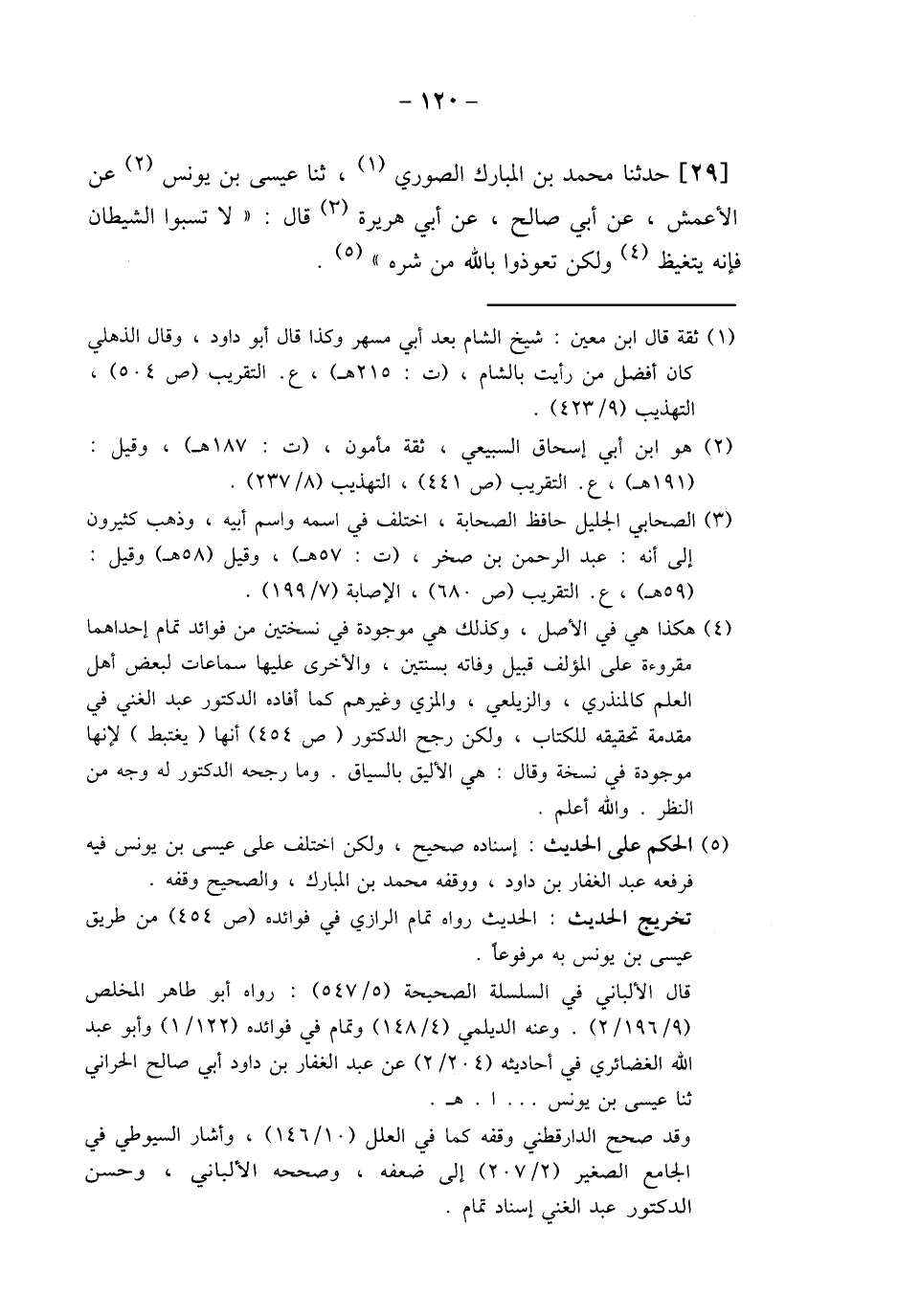 29 - حَدَّثَنَا مُحَمَّدُ بْنُ الْمُبَارَكِ الصُّورِيُّ، ثنا عِيسَى بْنُ يُونُسَ، عَنِ الْأَعْمَشِ، عَنْ أَبِي صَالِحٍ، عَنْ أَبِي هُرَيْرَةَ قَالَ: «§لَا تَسُبُّوا الشَّيْطَانَ، فَإِنَّهُ يَتَغَيَّظُ، وَلَكِنْ تَعَوَّذُوا بِاللَّهِ مِنْ شَرِّهِ»