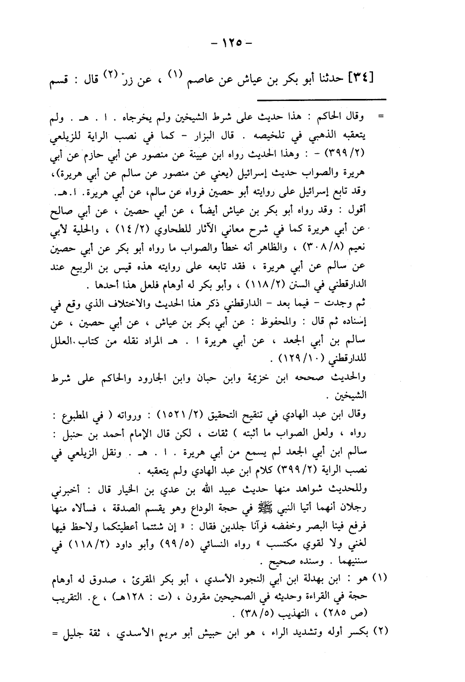 34 - حَدَّثَنَا أَبُو بَكْرِ بْنُ عَيَّاشٍ، عَنْ عَاصِمٍ، عَنْ زِرٍّ، قَالَ: «§قَسَمَ -[126]- عُمَرُ رَضِيَ اللَّهُ عَنْهُ الْمَالَ بَيْنَ الْعَمَّةِ وَالْخَالَةِ»