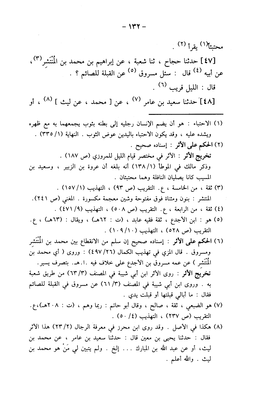 47 - حَدَّثَنَا حَجَّاجٌ، ثنا شُعْبَةُ، عَنْ إِبْرَاهِيمَ بْنِ مُحَمَّدِ بْنِ الْمُنْتَشِرِ، عَنْ أَبِيهِ قَالَ: سُئِلَ مَسْرُوقٌ §عَنِ الْقُبْلَةِ لِلصَّائِمِ، قَالَ: «اللَّيْلُ قَرِيبٌ»