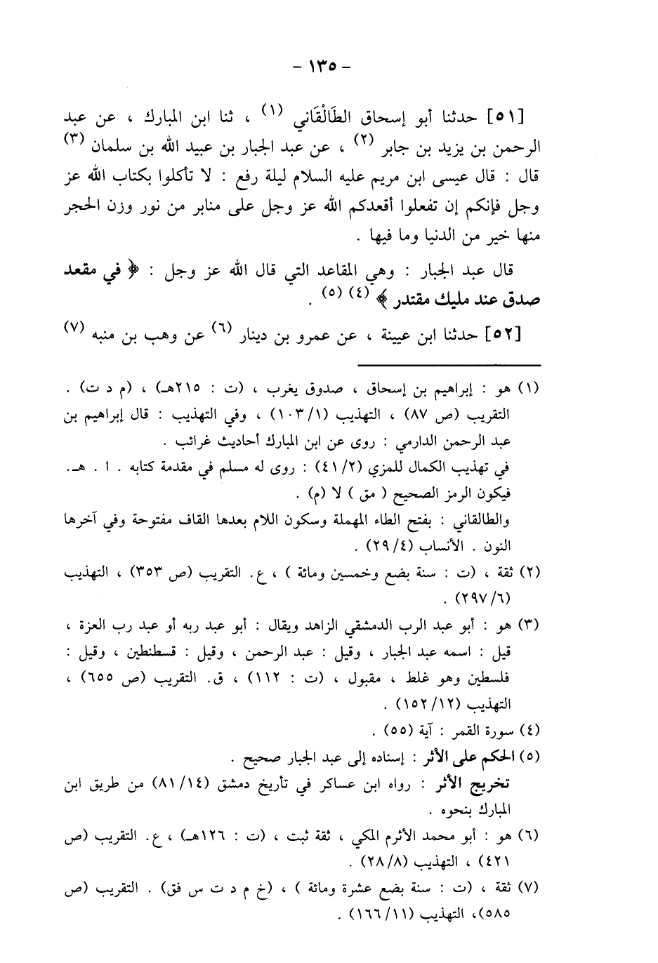 51 - حَدَّثَنَا أَبُو إِسْحَاقَ الطَّالْقَانِيُّ، ثنا ابْنُ الْمُبَارَكِ، عَنْ عَبْدِ الرَّحْمَنِ بْنِ يَزِيدَ بْنِ جَابِرٍ، عَنْ عَبْدِ الْجَبَّارِ بْنِ عُبَيْدِ اللَّهِ بْنِ سَلْمَانَ قَالَ: " §قَالَ عِيسَى ابْنُ مَرْيَمَ عَلَيْهِ السَّلَامُ لَيْلَةَ رُفِعَ: لَا تَأْكُلُوا بِكِتَابِ اللَّهِ عَزَّ وَجَلَّ، فَإِنَّكُمْ إِنْ تَفْعَلُوا أَقْعَدَكُمُ اللَّهُ عَزَّ وَجَلَّ عَلَى مَنَابِرَ مِنْ نُورٍ، وَزْنُ الْحَجَرِ، مِنْهَا خَيْرٌ مِنَ الدُّنْيَا وَمَا فِيهَا "، قَالَ عَبْدُ الْجَبَّارِ: " وَهِيَ الْمَقَاعِدُ الَّتِي قَالَ اللَّهُ عَزَّ وَجَلَّ: {فِي مَقْعَدِ صِدْقٍ عِنْدَ مَلِيكٍ مُقْتَدِرٍ} [القمر: 55] "