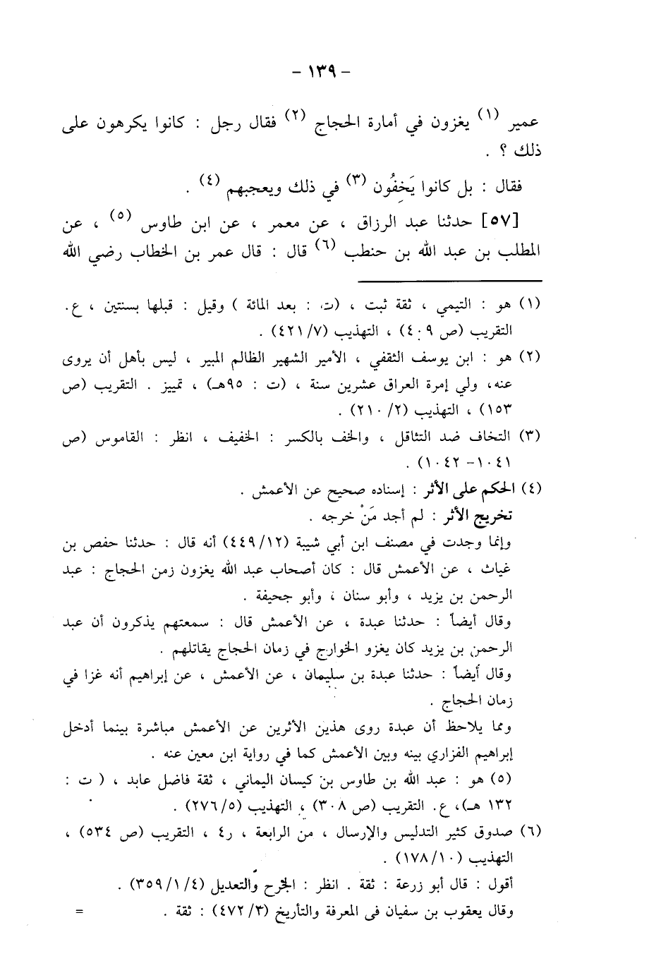 57 - حَدَّثَنَا عَبْدُ الرَّزَّاقِ، عَنْ مَعْمَرٍ، عَنِ ابْنِ طَاوُسٍ، عَنِ الْمُطَّلِبِ بْنِ عَبْدِ اللَّهِ بْنِ حَنْطَبٍ، قَالَ: قَالَ عُمَرُ بْنُ الْخَطَّابِ رَضِيَ اللَّهُ -[140]- عَنْهُ: «§لَا أُمَّ لِمَنْ أَدْرَكَتْهُ خِلَافَةُ ابْنِ الْمَخْزُومِيَّةِ»
