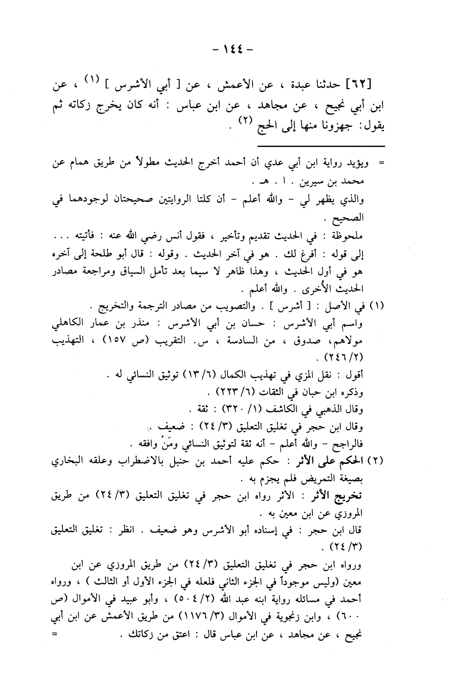 62 - حَدَّثَنَا عَبْدَةُ، عَنِ الْأَعْمَشِ، عَنْ أَبِي الْأَشْرَسِ، عَنِ ابْنِ أَبِي نَجِيحٍ، عَنْ مُجَاهِدٍ، عَنِ ابْنِ عَبَّاسٍ، أَنَّهُ كَانَ §يُخْرِجُ زَكَاتَهُ، ثُمَّ يَقُولُ: «جَهِّزُونَا مِنْهَا إِلَى الْحَجِّ»