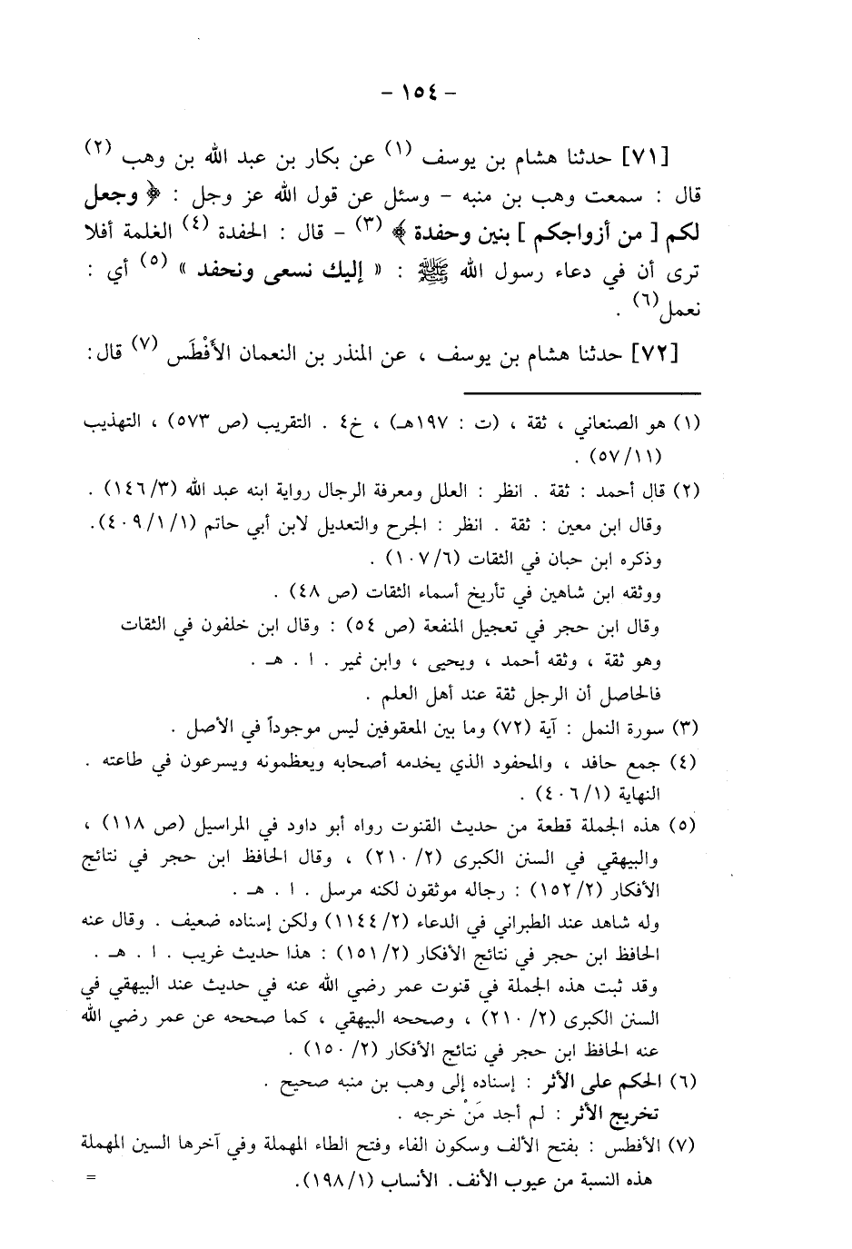 71 - حَدَّثَنَا هِشَامُ بْنُ يُوسُفَ، عَنْ بَكَّارِ بْنِ عَبْدِ اللَّهِ بْنِ وَهْبٍ، قَالَ: سَمِعْتُ وَهْبَ بْنَ مُنَبِّهٍ، وَسُئِلَ عَنْ قَوْلِ اللَّهِ عَزَّ وَجَلَّ: {وَجَعَلَ لَكُمْ مِنْ أَزْوَاجِكُمْ بَنِينَ وَحَفَدَةً} [النحل: 72] " قَالَ: " §الْحَفَدَةُ: الْغِلْمَةُ، أَفَلَا تَرَى أَنَّ فِيَ دُعَاءِ رَسُولِ اللَّهِ صَلَّى اللهُ عَلَيْهِ وَسَلَّمَ: إِلَيْكَ نَسْعَى وَنَحْفِدُ " أَيْ: نَعْمَلُ "