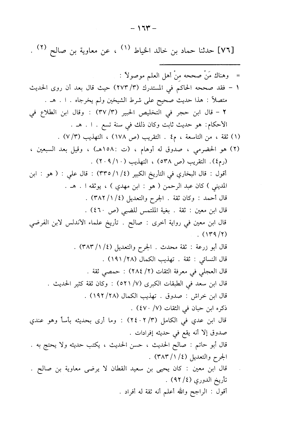 76 - حَدَّثَنَا حَمَّادُ بْنُ خَالِدٍ الْخَيَّاطُ، عَنْ مُعَاوِيَةَ بْنِ صَالِحٍ -[164]-، عَنْ عَبْدِ الرَّحْمَنِ بْنِ جُبَيْرِ بْنِ نُفَيْرٍ، عَنْ أَبِيهِ، عَنْ أَبِي ثَعْلَبَةَ الْخُشَنِيِّ، عَنِ النَّبِيِّ صَلَّى اللهُ عَلَيْهِ وَسَلَّمَ قَالَ: «§إِنْ رَمَيْتَ الصَّيْدَ فَأَدْرَكْتَهُ بَعْدَ ثَلَاثِ لَيَالٍ وَسَهْمُكَ فِيهِ فَكُلْهُ، مَا لَمْ يَنْتُنْ»