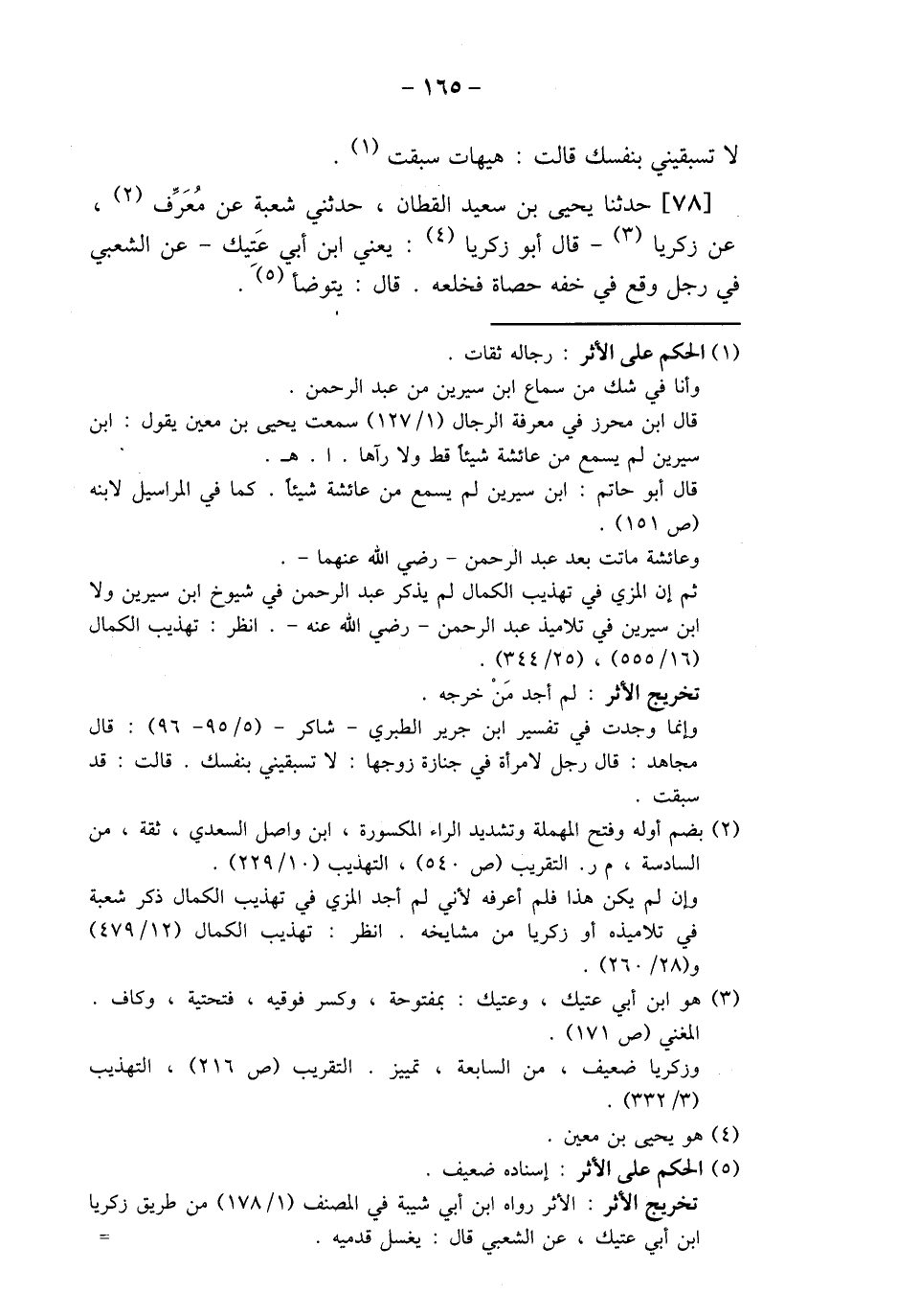 78 - حَدَّثَنَا يَحْيَى بْنُ سَعِيدٍ الْقَطَّانُ، حَدَّثَنِي شُعْبَةُ، عَنْ مُعَرِّفٍ، عَنْ زَكَرِيَّا، - قَالَ: أَبُو زَكَرِيَّا يَعْنِي ابْنَ أَبِي عَتِيكٍ -، عَنِ الشَّعْبِيِّ §فِي رَجُلٍ وَقَعَ فِي خُفَّهِ حَصَاةٌ، فَخَلَعَهُ "، قَالَ: «يَتَوَضَّأُ»