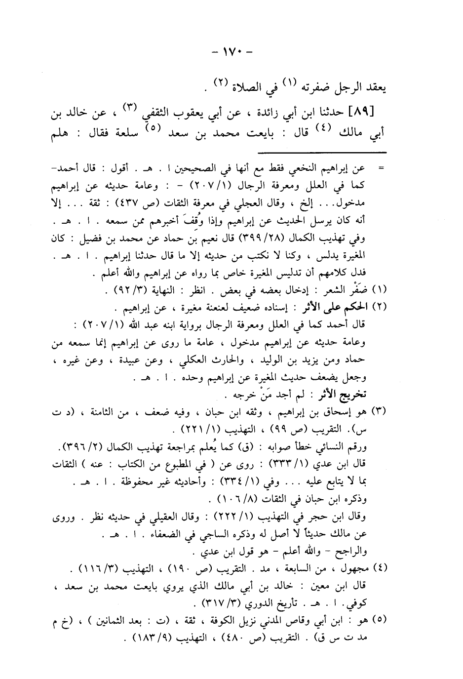 89 - حَدَّثَنَا ابْنُ أَبِي زَائِدَةَ، عَنْ أَبِي يَعْقُوبَ الثَّقَفِيِّ، عَنْ خَالِدِ بْنِ أَبِي مَالِكٍ قَالَ: بَايَعْتُ مُحَمَّدَ بْنَ سَعْدٍ سِلْعَةً، فَقَالَ: هَلُمَّ -[171]- أُمَاسِحُكَ، إِنَّ رَسُولَ اللَّهِ صَلَّى اللهُ عَلَيْهِ وَسَلَّمَ، قَالَ: «§الْبَرَكَةُ فِي الْمُمَاسَحَةِ»