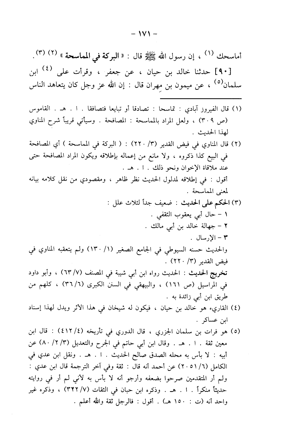 90 - حَدَّثَنَا خَالِدُ بْنُ حَيَّانَ، عَنْ جَعْفَرٍ، وَقَرَأْتُ، عَلَى ابْنِ سَلْمَانَ، عَنْ مَيْمُونِ بْنِ مِهْرَانَ قَالَ: «إِنَّ §اللَّهَ عَزَّ وَجَلَّ كَانَ يَتَعَاهَدُ النَّاسَ -[172]- بِنَبِيٍّ بَعْدَ نَبِيٍّ، وَإِنَّ اللَّهَ عَزَّ وَجَلَّ تَعَاهَدَ النَّاسَ بِعُمَرَ بْنِ عَبْدِ الْعَزِيزِ»
