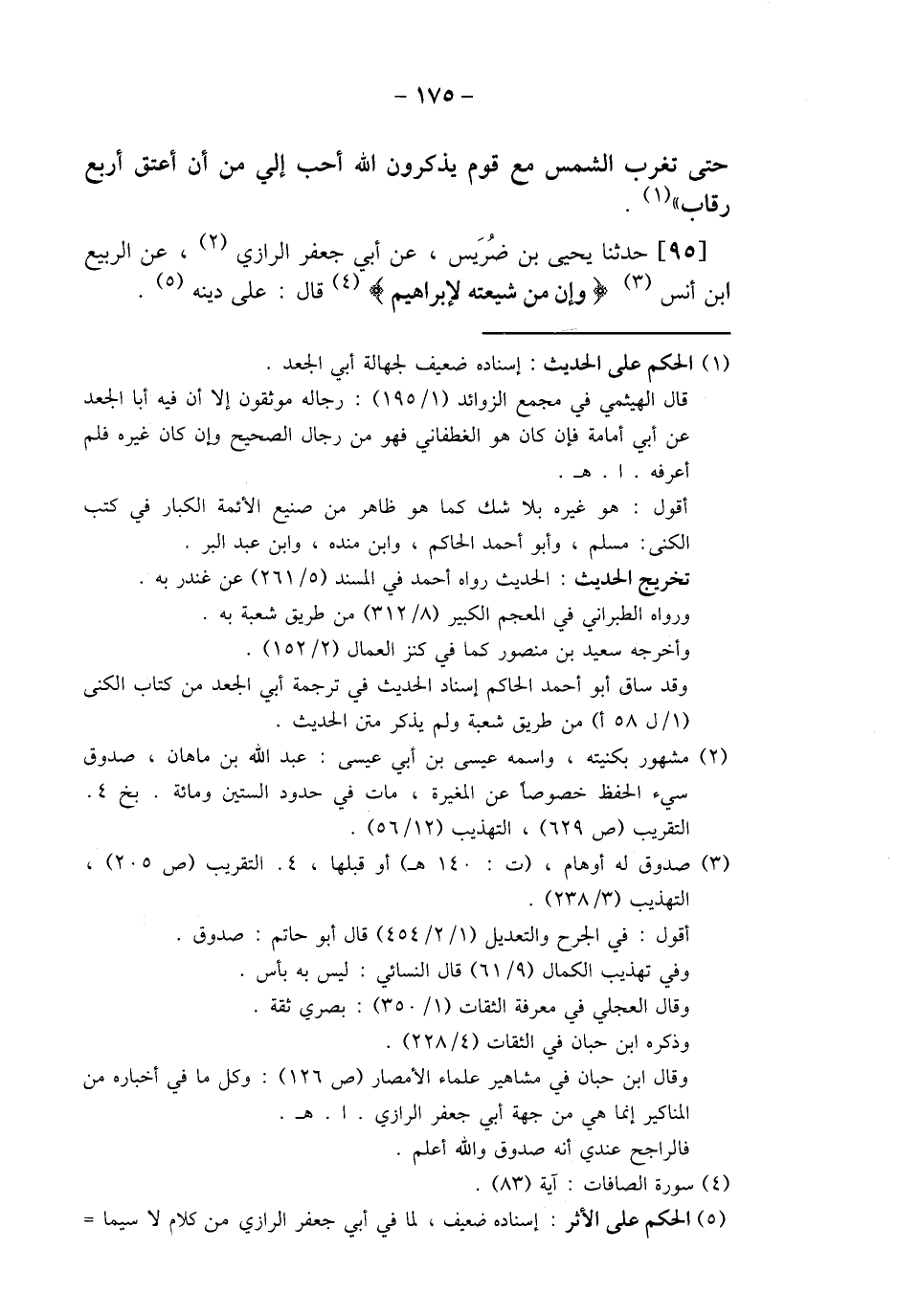 95 - حَدَّثَنَا يَحْيَى بْنُ ضُرَيْسٍ، عَنْ أَبِي جَعْفَرٍ الرَّازِيِّ، عَنِ الرَّبِيعِ بْنِ أَنَسٍ، {§وَإِنَّ مِنْ شِيعَتِهِ لِإِبْرَاهِيمَ} [الصافات: 83] قَالَ: «عَلَى دِينِهِ»