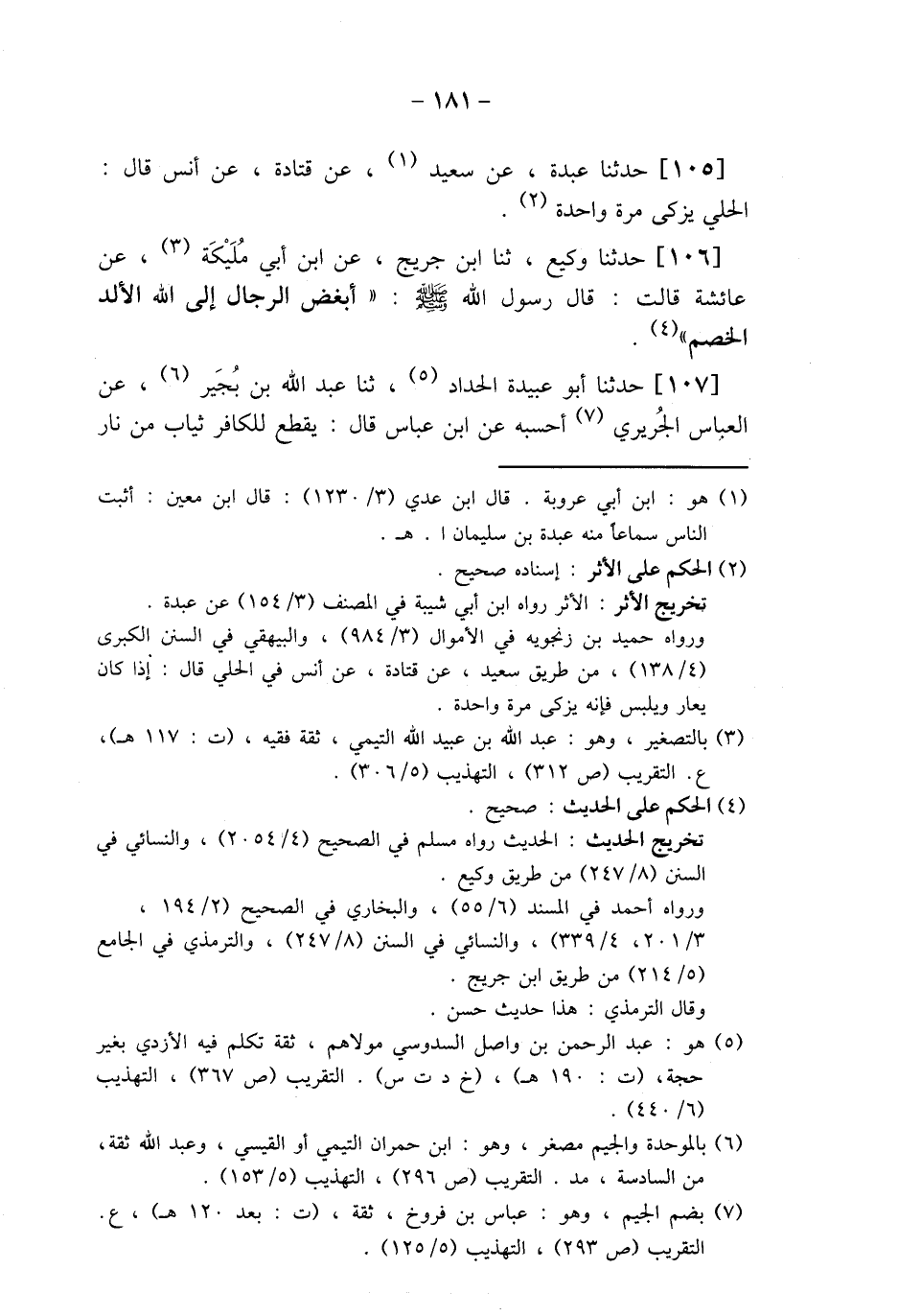 105 - حَدَّثَنَا عَبْدَةُ، عَنْ سَعِيدٍ، عَنْ قَتَادَةَ، عَنْ أَنَسٍ قَالَ: «§الْحُلِيُّ يُزَكَّى مَرَّةً وَاحِدَةً»