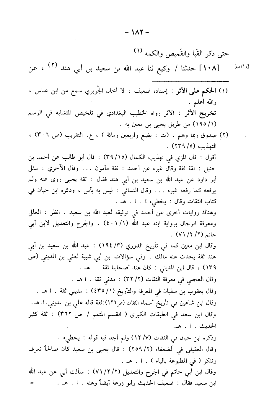 108 - حَدَّثَنَا وَكِيعٌ، ثنا عَبْدُ اللَّهِ بْنُ سَعِيدِ بْنِ أَبِي هِنْدٍ، عَنْ -[183]- مُحَمَّدِ بْنِ عَبْدِ اللَّهِ بْنِ عَمْرِو بْنِ عُثْمَانَ، عَنْ فَاطِمَةَ بِنْتِ حُسَيْنٍ، عَنِ ابْنِ عَبَّاسٍ قَالَ: قَالَ رَسُولُ اللَّهِ صَلَّى اللهُ عَلَيْهِ وَسَلَّمَ: «§لَا تُدِيمُوا النَّظَرَ إِلَى الْمُجَذَّمِينَ»