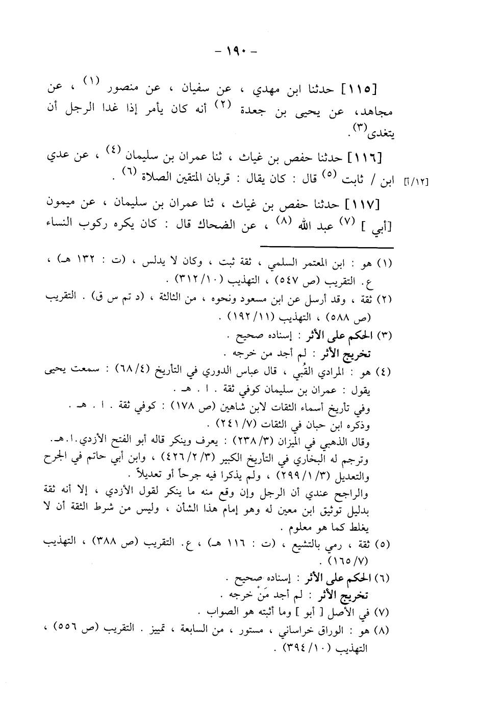 117 - حَدَّثَنَا حَفْصُ بْنُ غِيَاثٍ، ثنا عِمْرَانُ بْنُ سُلَيْمَانَ، عَنْ مَيْمُونِ أَبِي عَبْدِ اللَّهِ، عَنِ الضَّحَّاكِ قَالَ: «كَانَ §يُكْرَهُ رُكُوبُ النِّسَاءِ -[191]- السُّرُوجَ»