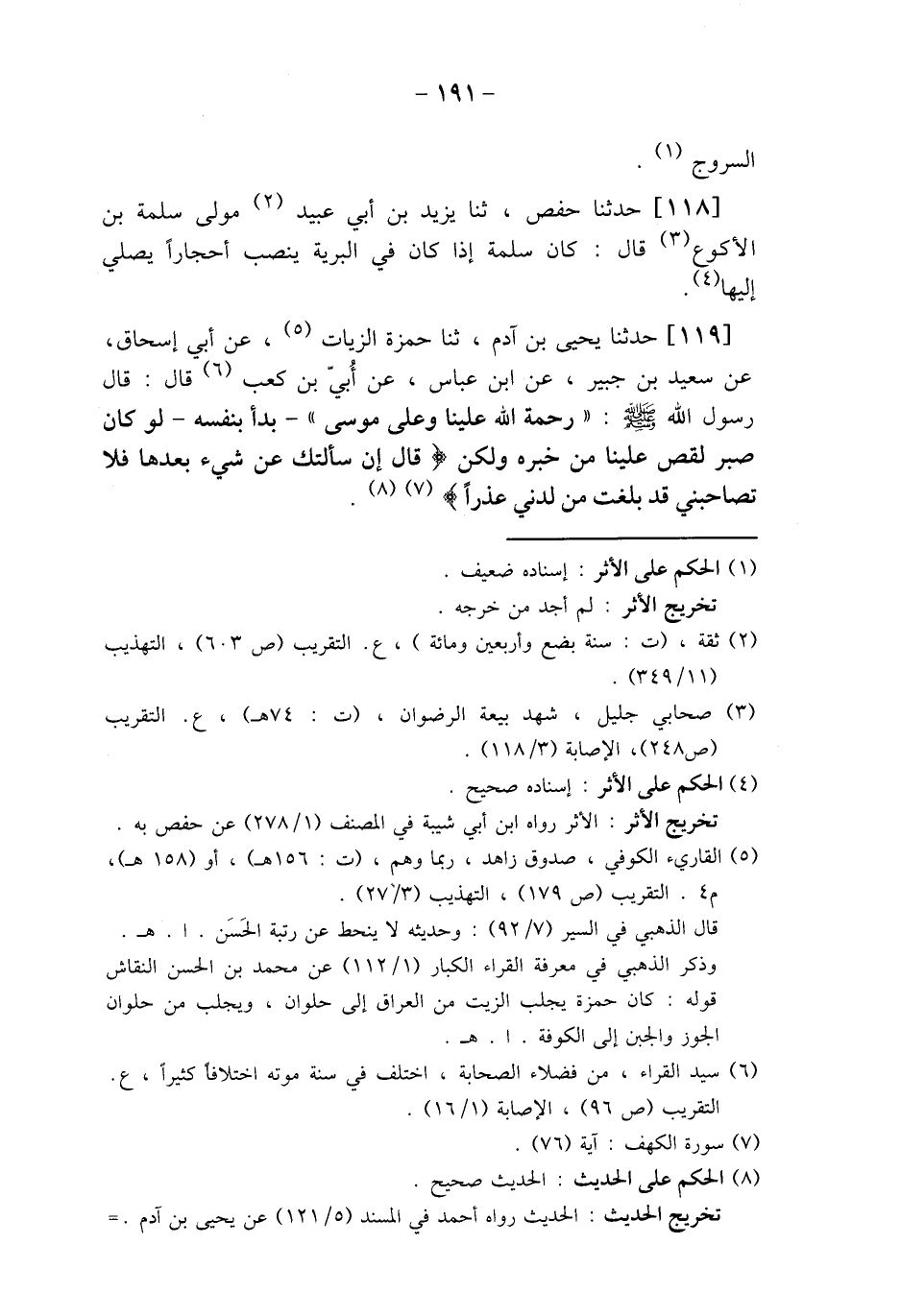 119 - حَدَّثَنَا يَحْيَى بْنُ آدَمَ، ثنا حَمْزَةُ الزَّيَّاتُ، عَنْ أَبِي إِسْحَاقَ، عَنْ سَعِيدِ بْنِ جُبَيْرٍ، عَنِ ابْنِ عَبَّاسٍ، عَنْ أُبَيِّ بْنِ كَعْبٍ قَالَ: قَالَ رَسُولُ اللَّهِ صَلَّى اللهُ عَلَيْهِ وَسَلَّمَ: " §رَحْمَةُ اللَّهِ عَلَيْنَا وَعَلَى مُوسَى - بَدَأَ بِنَفْسِهِ - لَوْ كَانَ صَبَرَ لَقَصَّ عَلَيْنَا مِنْ خَبَرِهِ، وَلَكِنْ {قَالَ إِنْ سَأَلْتُكَ عَنْ شَيْءٍ بَعْدَهَا فَلَا تُصَاحِبْنِي قَدْ بَلَغْتَ مِنْ لَدُنِّي عُذْرًا} [الكهف: 76] "