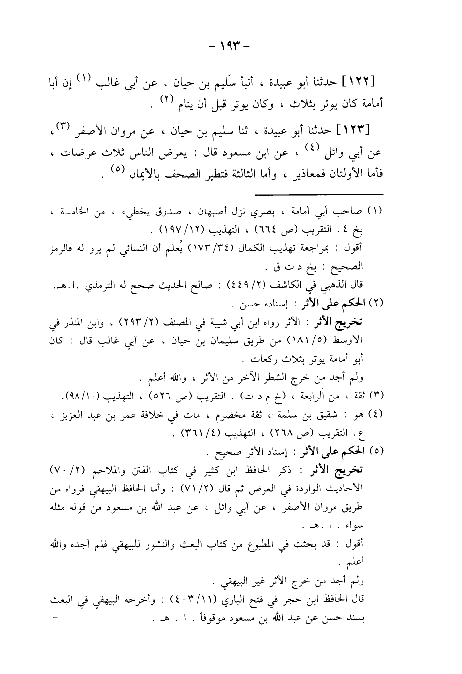 122 - حَدَّثَنَا أَبُو عُبَيْدَةَ، أَنْبَأَ سُلَيْمُ بْنُ حَيَّانَ، عَنْ أَبِي غَالِبٍ، إِنَّ أَبَا أُمَامَةَ «كَانَ §يُوتِرُ بِثَلَاثٍ، وَكَانَ يُوتِرُ قَبْلَ أَنْ يَنَامَ»